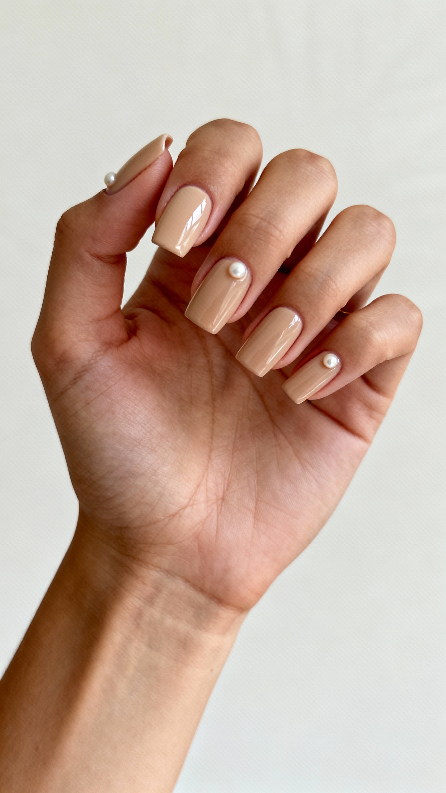 If you want something bridal but not boring, a sandy beige nude with a few strategically placed tiny pearls is your best friend. The vibe is coastal wedding, garden party, or destination chic—minimal base, elevated detail. Go for a short squoval or short almond so the pearls feel intentional, not heavy. Practical tip: keep pearl accents to 1–2 nails per hand and ask your tech to encapsulate them (or secure with hard gel) so they won’t pop off when humidity + handwashing are nonstop.