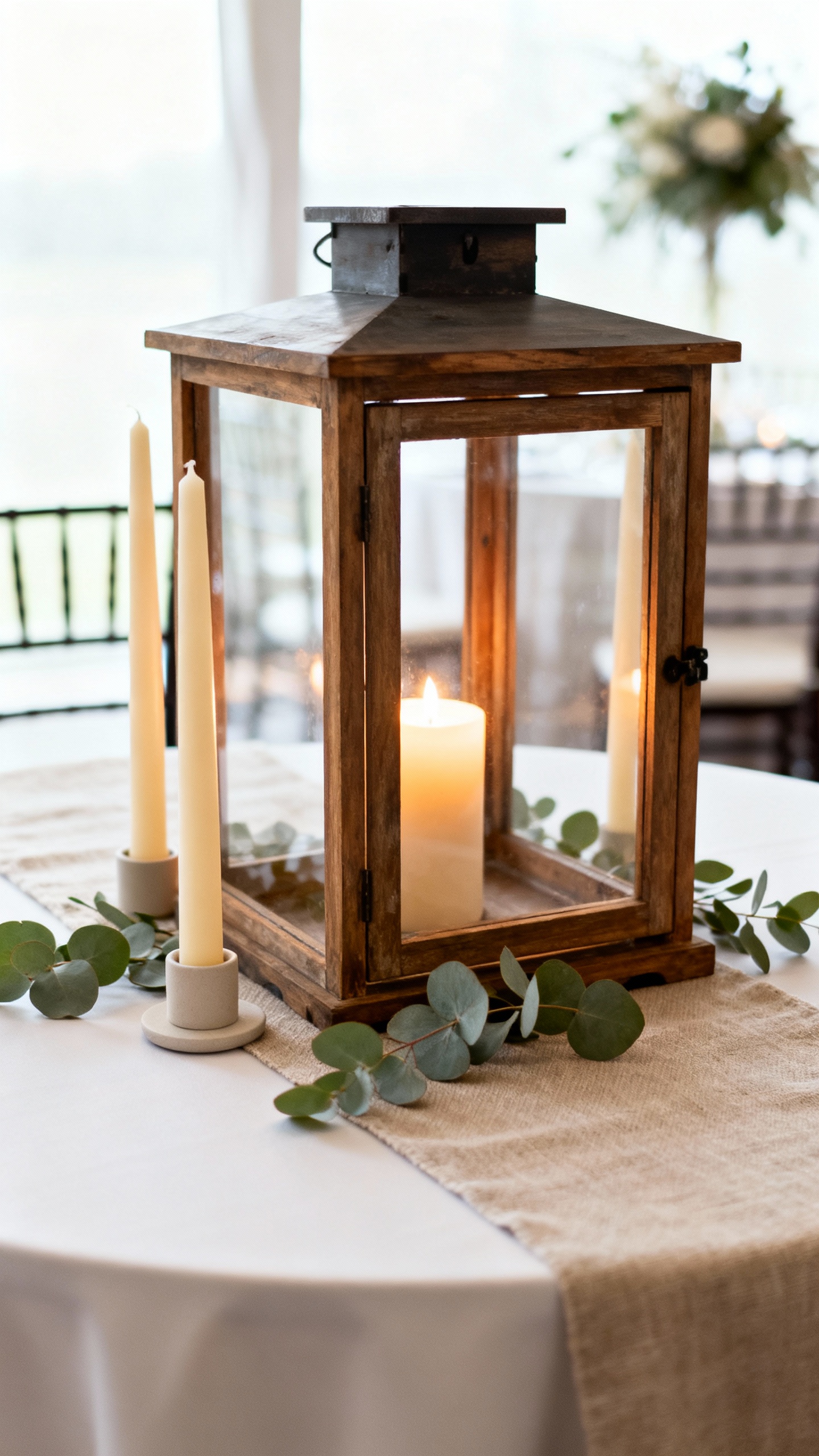 A large wooden lantern gives rustic warmth, but the open sides keep it from feeling like a wall on the table. Add two to three taper candles in slim holders around it to create height without bulk. Finish with a small ring of greenery at the base so the table still feels intentional, not crowded.