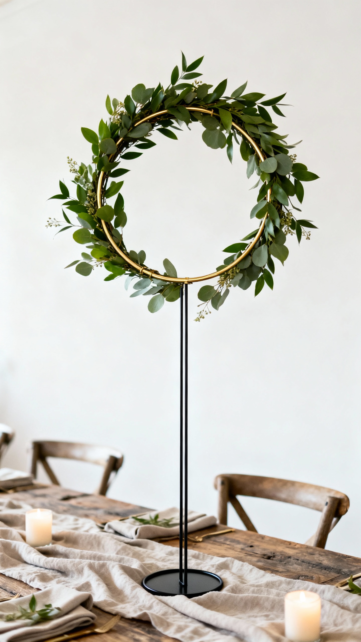 A slim wire stand is perfect for rustic tables because it adds height with almost zero visual weight. Attach a greenery hoop at the top (think wreath shape) so the “fullness” is up high and the space between guests stays open. Add a few small blooms or dried accents for texture that feels intentional and seasonal.