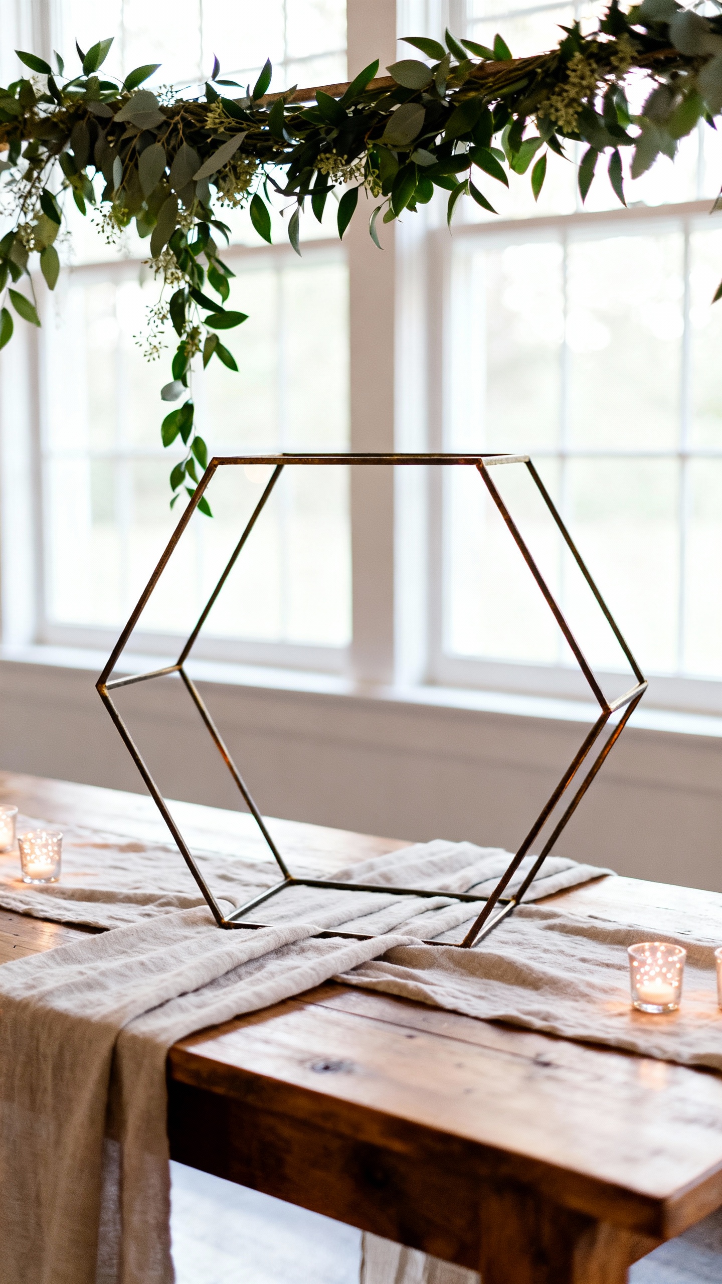 A geometric frame (cube, hexagon, or triangle) gives height, structure, and that modern-rustic balance. Add greenery draped from the top edge so the design lives above eye level, leaving the middle open for sightlines. Bonus: it photographs so well from every angle, especially with warm ambient lighting.