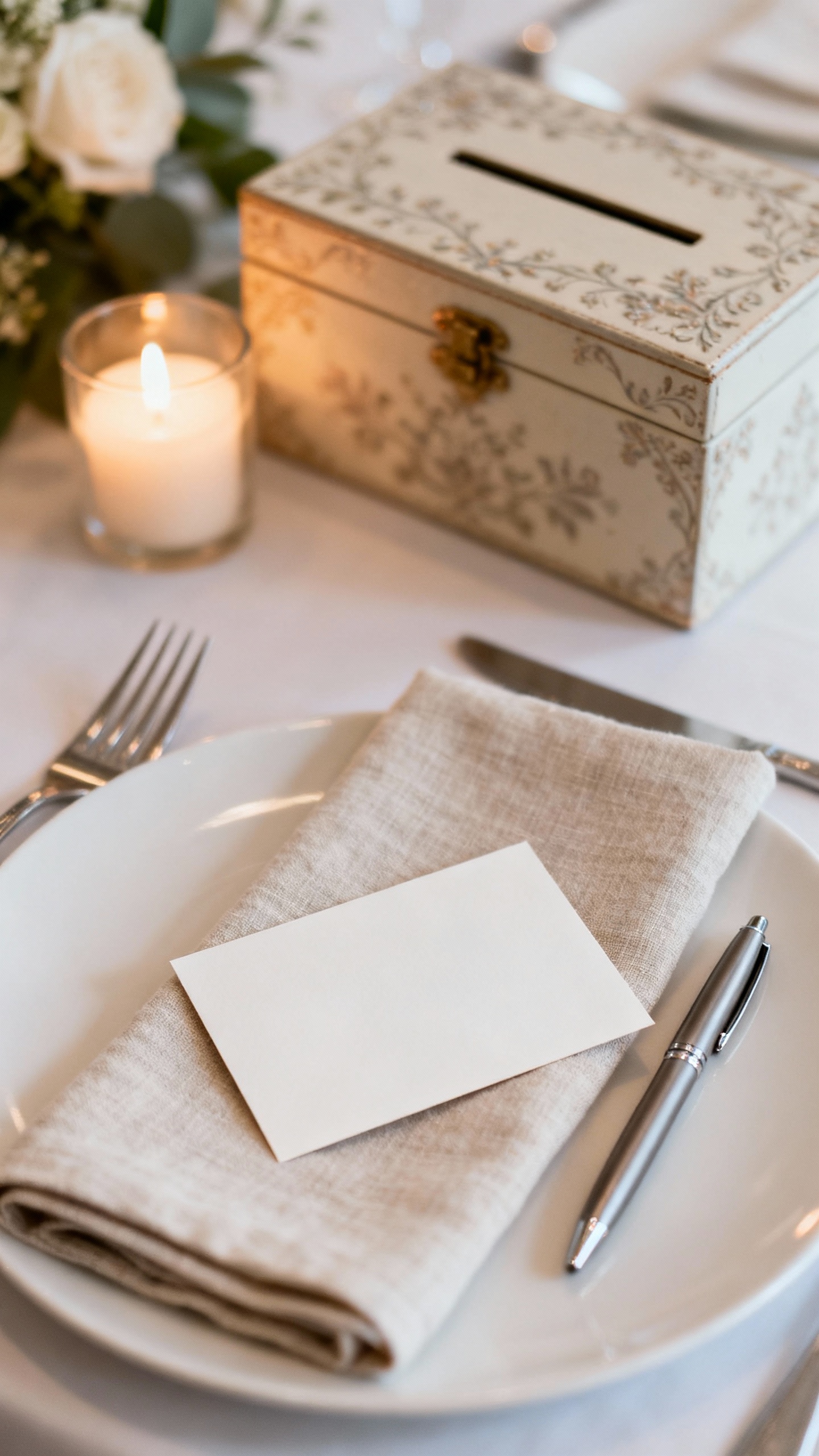 Slip a small card under the napkin that says, “Write one thing you’re grateful for today” or “Write a short prayer/blessing for the couple.” Guests can drop them into a pretty box near the head table or the guest book. It doubles as meaningful keepsakes and a faith-forward detail that still feels modern and interactive (and yes, it photographs beautifully).