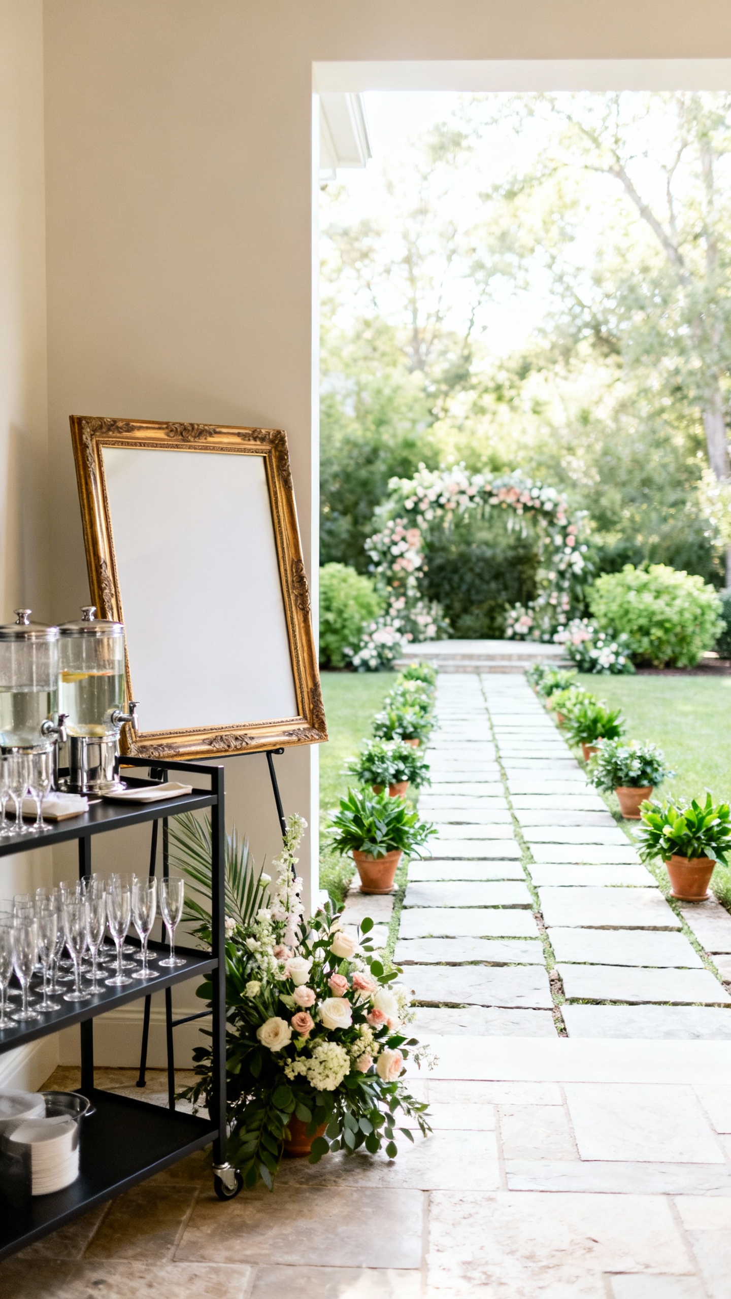 Guests decide the vibe in the first 30 seconds, so give them a real arrival experience. Start with a styled welcome sign, a cute little “grab a drink” station, and a defined pathway to the ceremony or reception area. Use potted plants, candle clusters (LED is totally fine), or floral arrangements to line the walk. It’s a simple way to say “this is a wedding” before anyone even sits down.