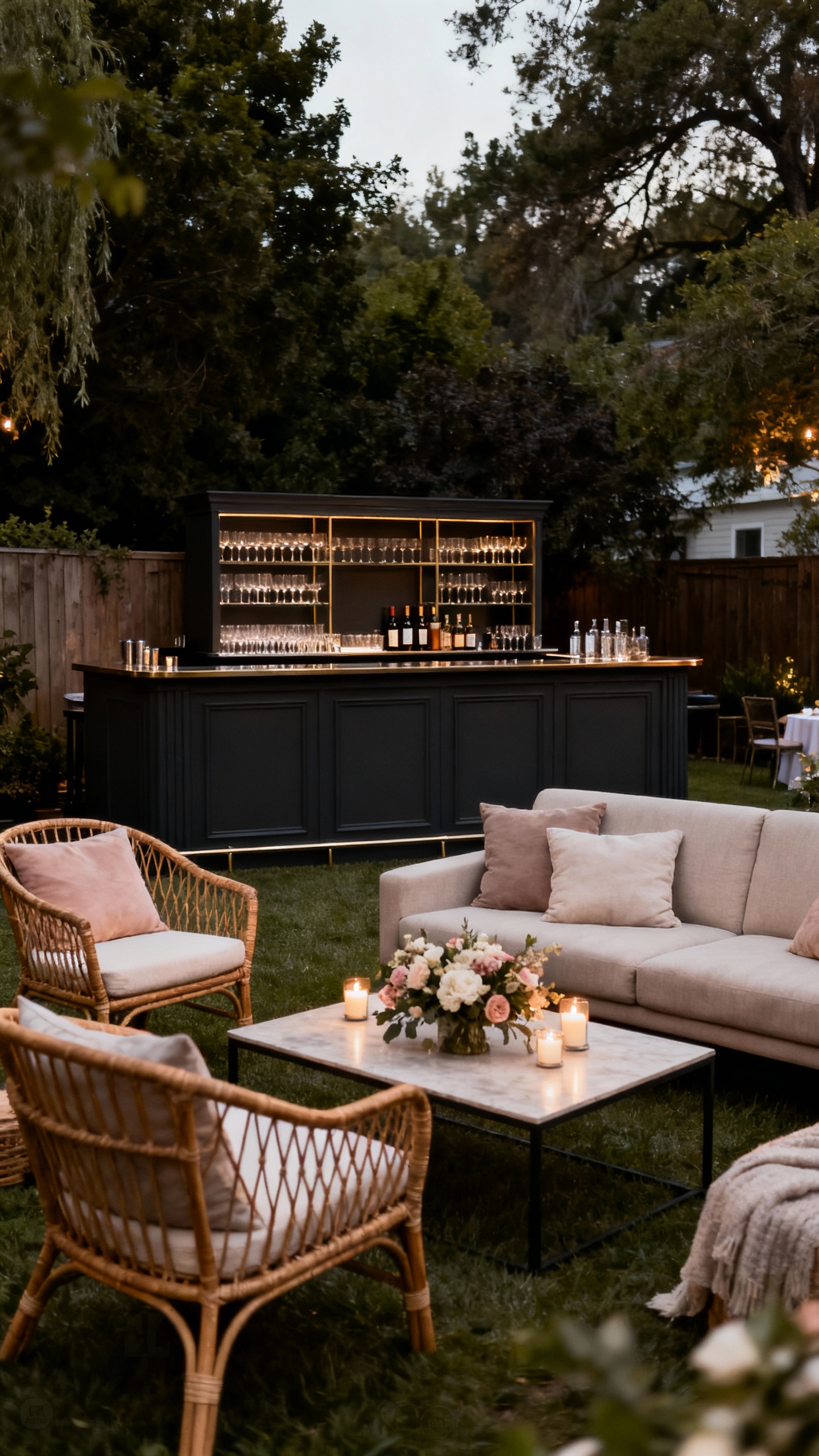 Venues feel elevated because there are distinct areas—dining isn’t the same place as mingling. Create a bar setup with a rented bar front or a styled table, plus a simple menu sign and matching glassware. Then add a lounge: a few couches or chairs, layered rugs, and low tables so guests naturally gather and relax. This one detail makes your home wedding feel like a thoughtfully designed event, not a single open space.
