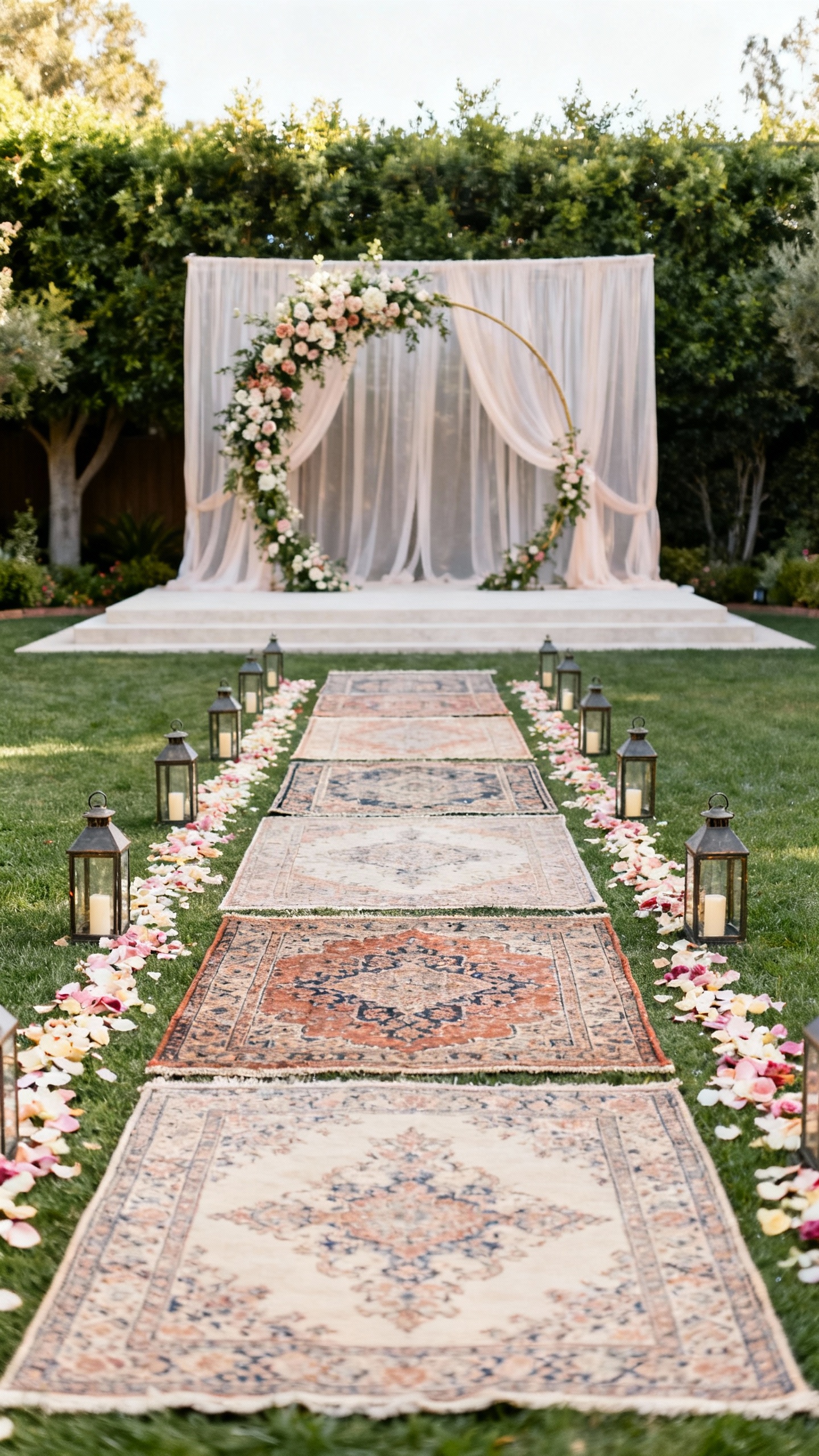 A venue feels like a venue because it has a focal point—so build one. Choose a clear ceremony backdrop (arch, layered draping, or a floral moment) and mark an aisle with rugs, petals, lanterns, or lined chairs. Angle seating so everyone can actually see, and place the ceremony where the light is best (golden hour is your best friend). The result is instantly more intentional and photo-ready.