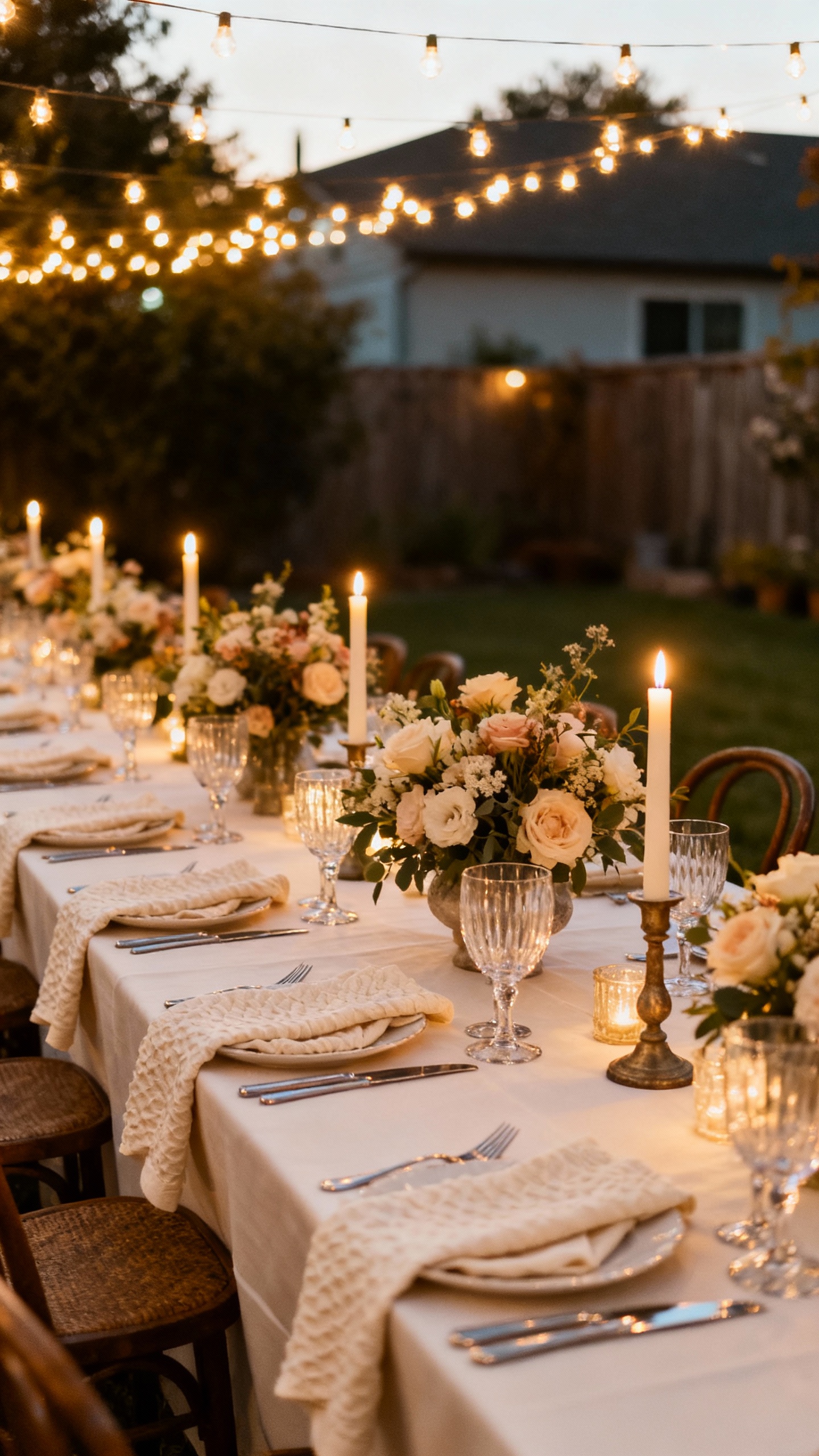 If you want “venue,” you need a dining moment that looks intentional from every angle. Choose linens (even simple ivory) and add texture with napkins, taper candles, and cohesive centerpieces that match your color palette. Use consistent place settings and glassware, and don’t forget menu cards or place cards for that polished finish. The glow of good lighting over a styled table is what makes backyard weddings look editorial.
