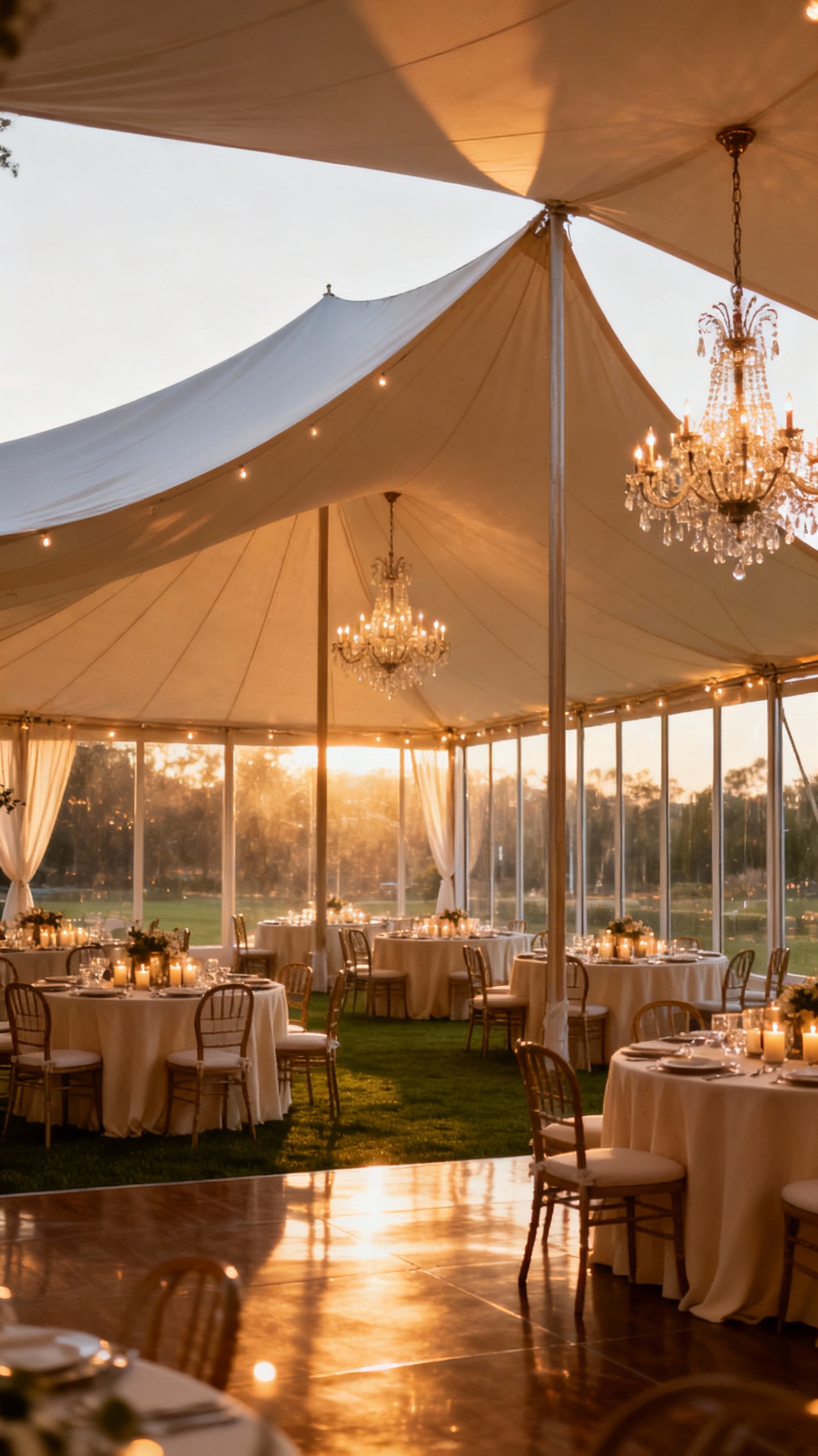 Layered lighting is the secret: overhead bistro lights or chandeliers, table candles, and a few uplights for trees or the tent perimeter. Aim for warm bulbs (not bright white) and place lighting where people will be photographed—entry, bar, and dance floor.