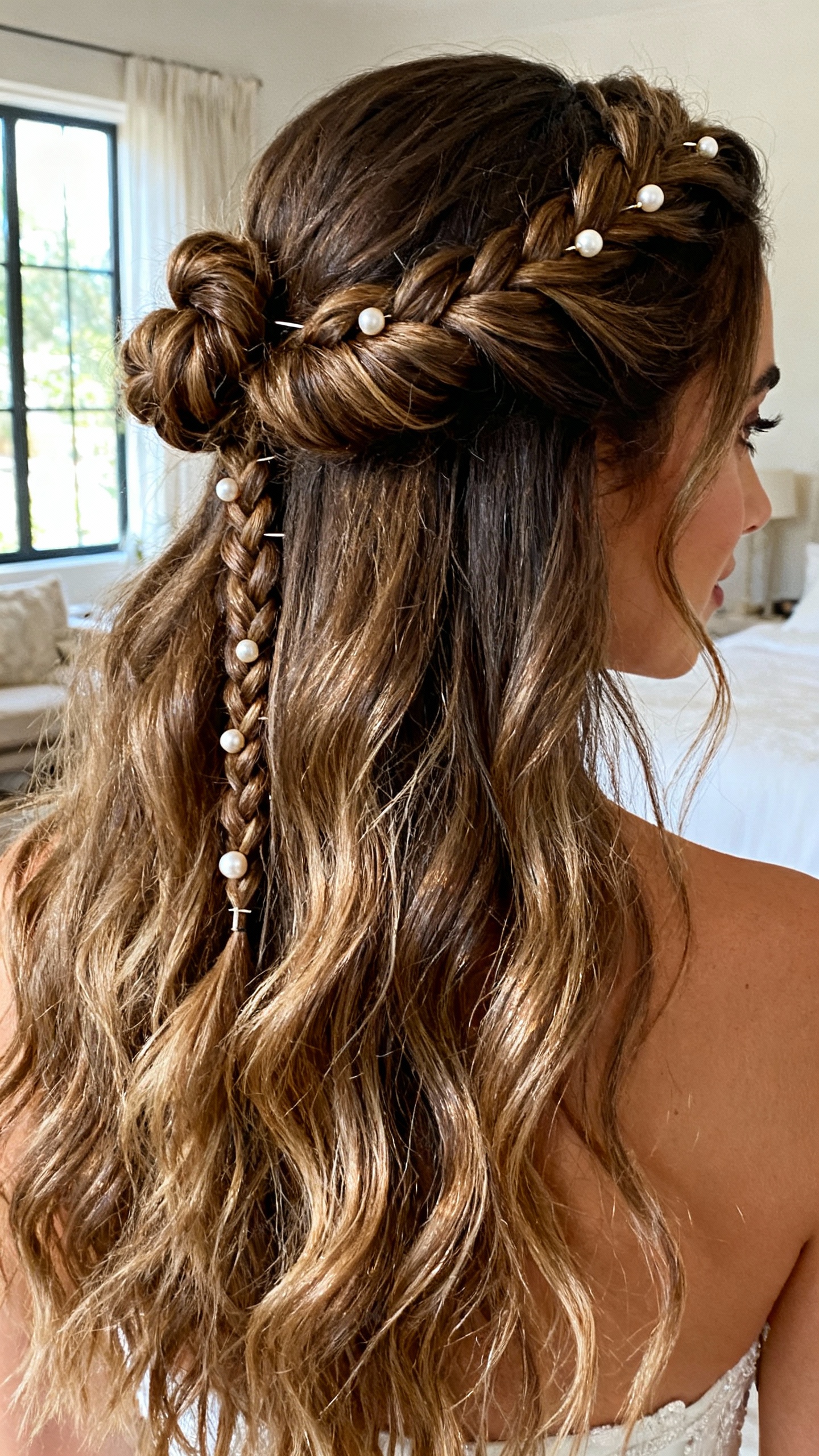 This is the budget bride bestie of “I want my hair down but still bridal,” and it looks amazing on medium to long hair with natural wave, curls, or heat-styled bends. The vibe is soft, youthful, and dreamy—especially with a small pearl comb or floral pins tucked into the twist. Practical tip: curl first, then twist back and secure with a small clear elastic plus pins; if you’re wearing a veil, set the comb just below the twist so the twist hides the attachment and looks intentional.