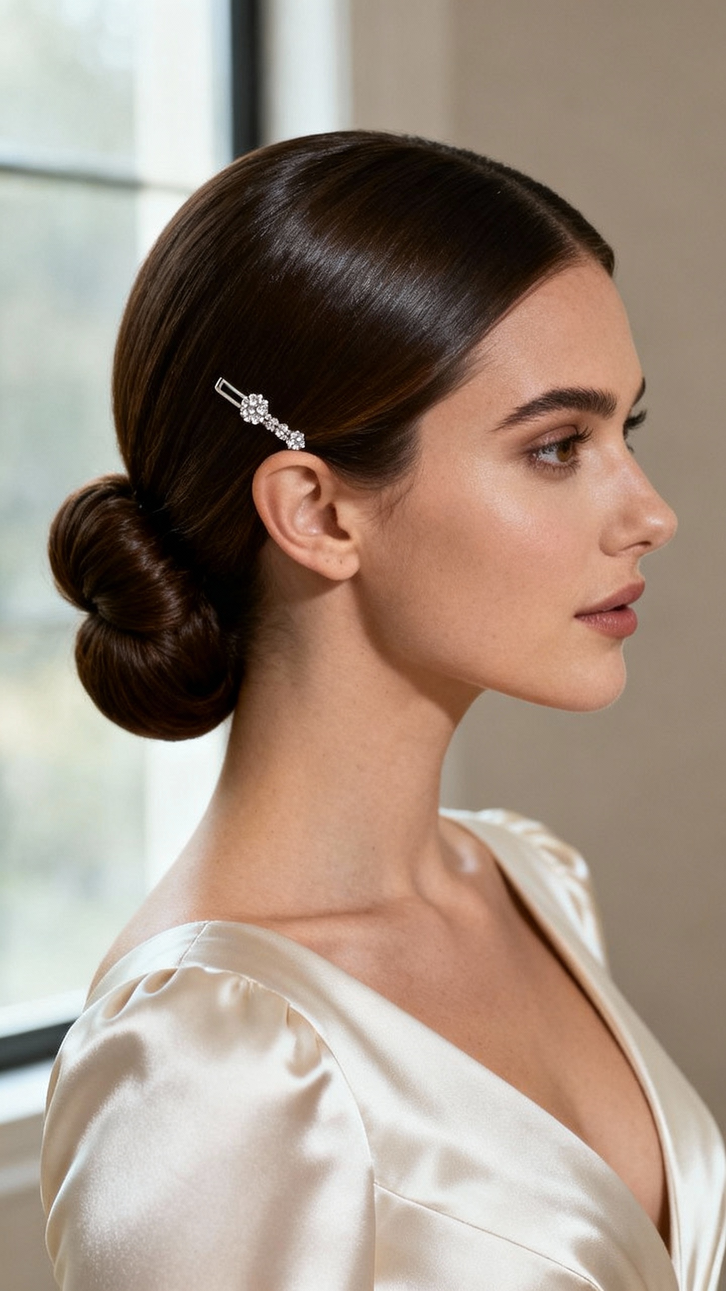 This is the ultimate “quiet luxury” bridal hairstyle and it flatters almost everyone—especially oval, heart, and round face shapes because the center part creates balance. The vibe is modern, elegant, and timeless in photos (hello, snatched profile). Practical tip: smooth a pea-size amount of anti-frizz cream over the surface, then lock the bun with a strong-hold hairspray misted onto a toothbrush for flyaways; place a veil right above the bun for the most secure anchor point.