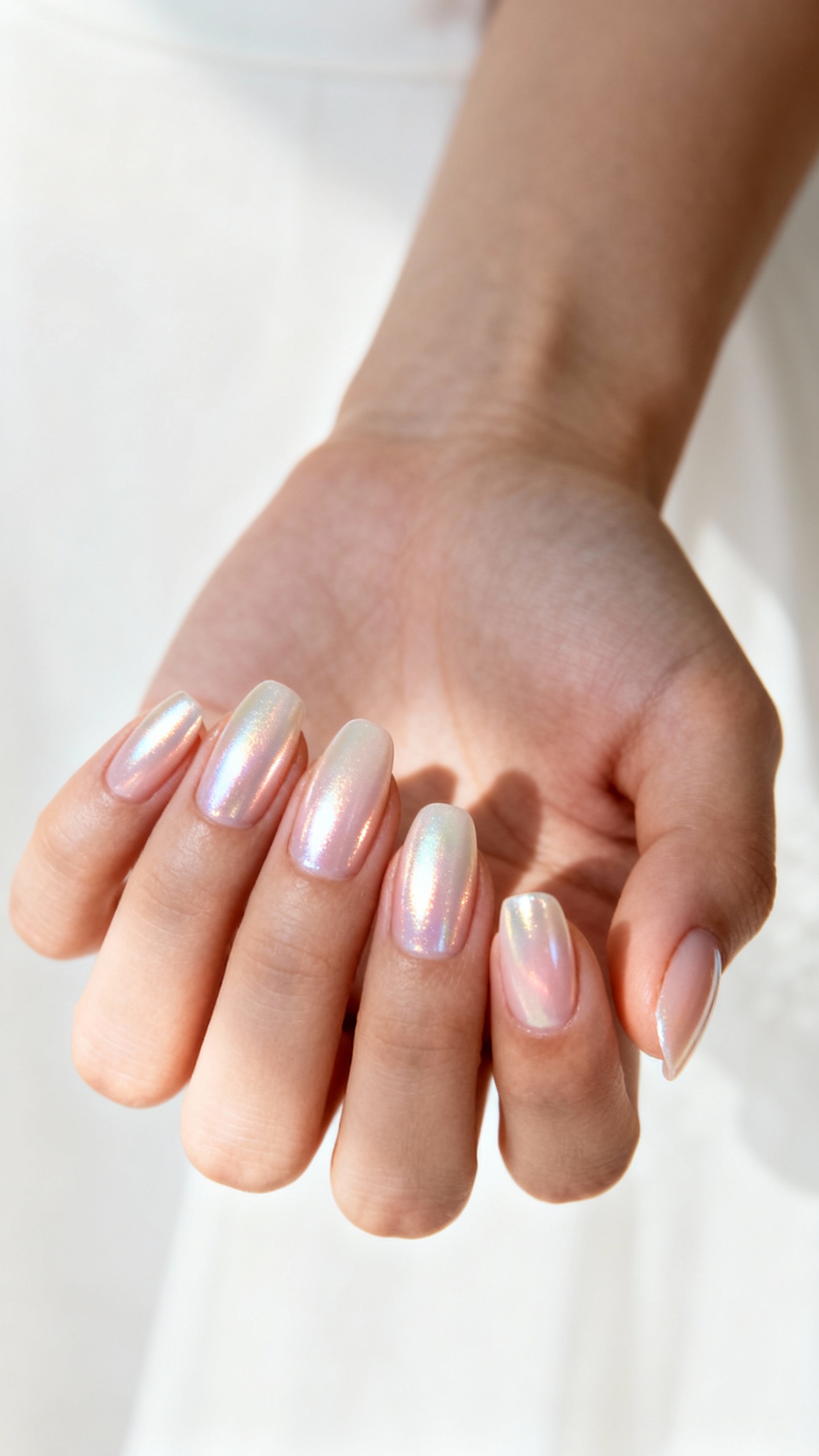 If you want your nails to catch the light in the prettiest way, go for a pearly chrome glaze over a nude or milky base—think soft shimmer, not mirror disco. It gives “expensive manicure” energy while staying simple enough for most salons: nude gel polish + a light pearl chrome powder + glossy top coat. This is gorgeous on short almond, oval, or even natural rounded nails and photographs beautifully next to satin, pearls, and lace. Wear tip: chrome lasts best on gel; ask your tech to cap the free edge with top coat so the shine doesn’t wear down at the tips.