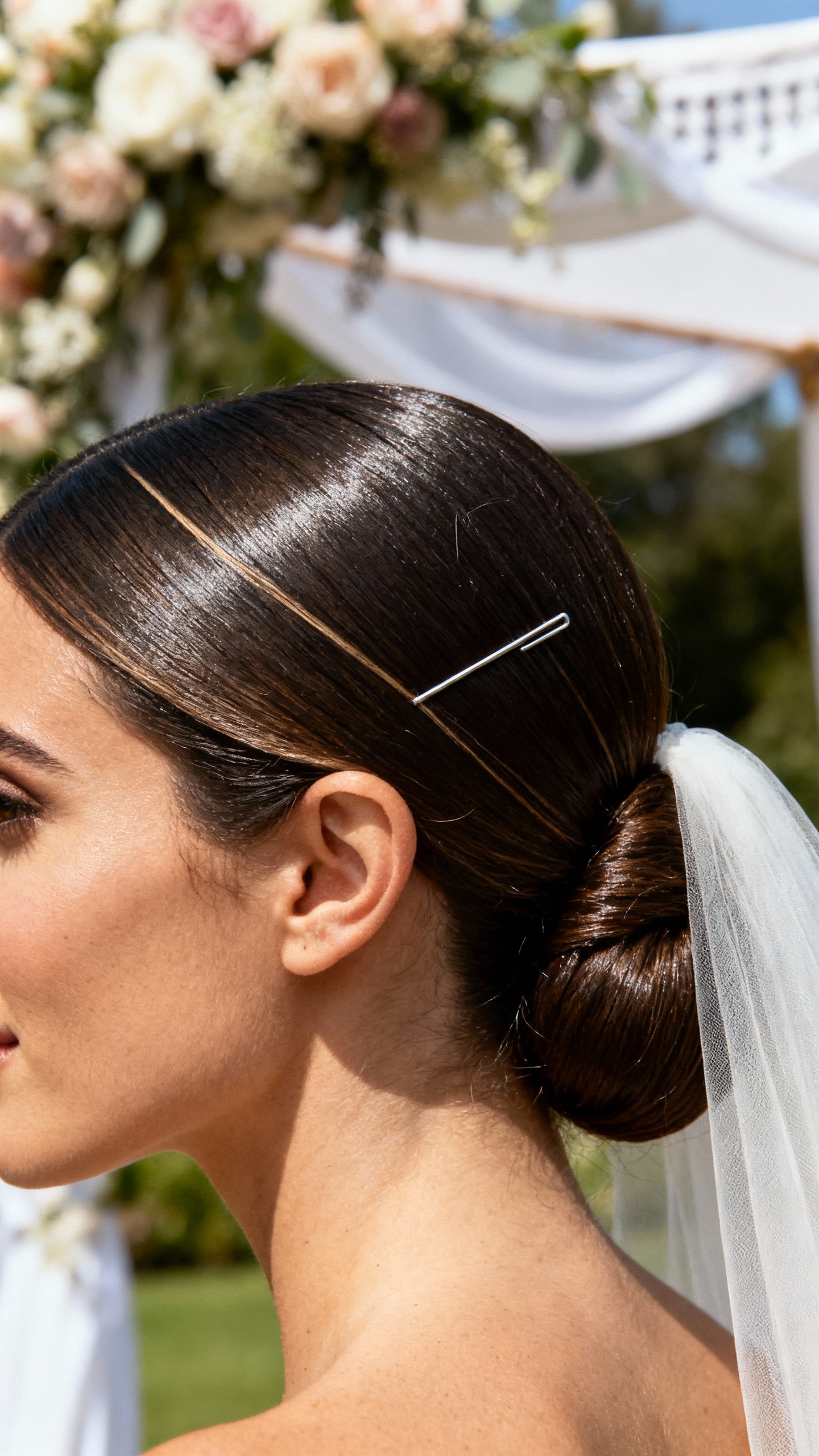 A sleek, center-part chignon is clean, editorial, and insanely chic under a chuppah—especially if your ceremony space has dramatic florals or fabric draping. It flatters symmetrical features and works beautifully for brides who love minimalist glamour or have a statement dress neckline. Practical tip: use a smoothing cream plus a strong-hold gel just at the roots and part line, then finish with shine spray so the style reads “glossy” in photos, not frizzy.