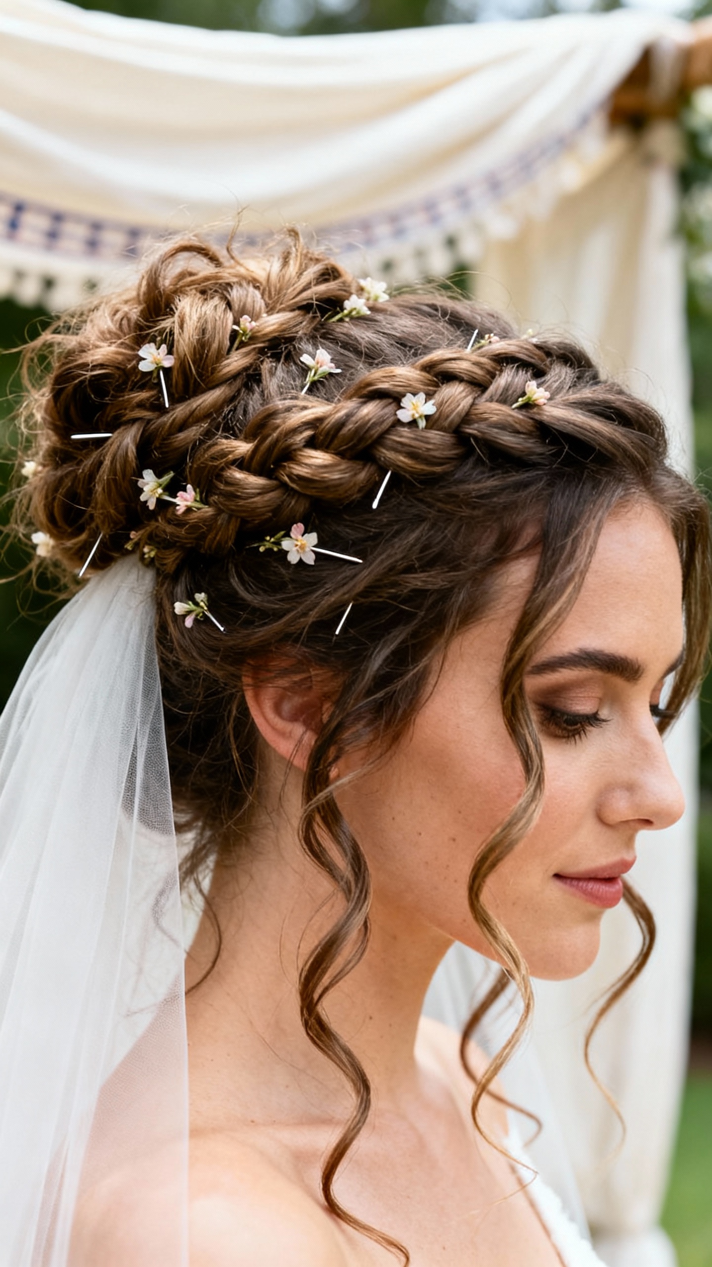 This one is made for movement: a softly textured updo with twists or loose pins, plus a few intentional tendrils to frame your face. It flatters square and angular face shapes by softening the jawline, and it gives a romantic, slightly boho vibe that looks dreamy in chuppah portraits. Practical tip: if your hair is fine or slippery, ask for a light backcomb at the crown and a powder texturizer before pinning—your updo will hold without feeling heavy.