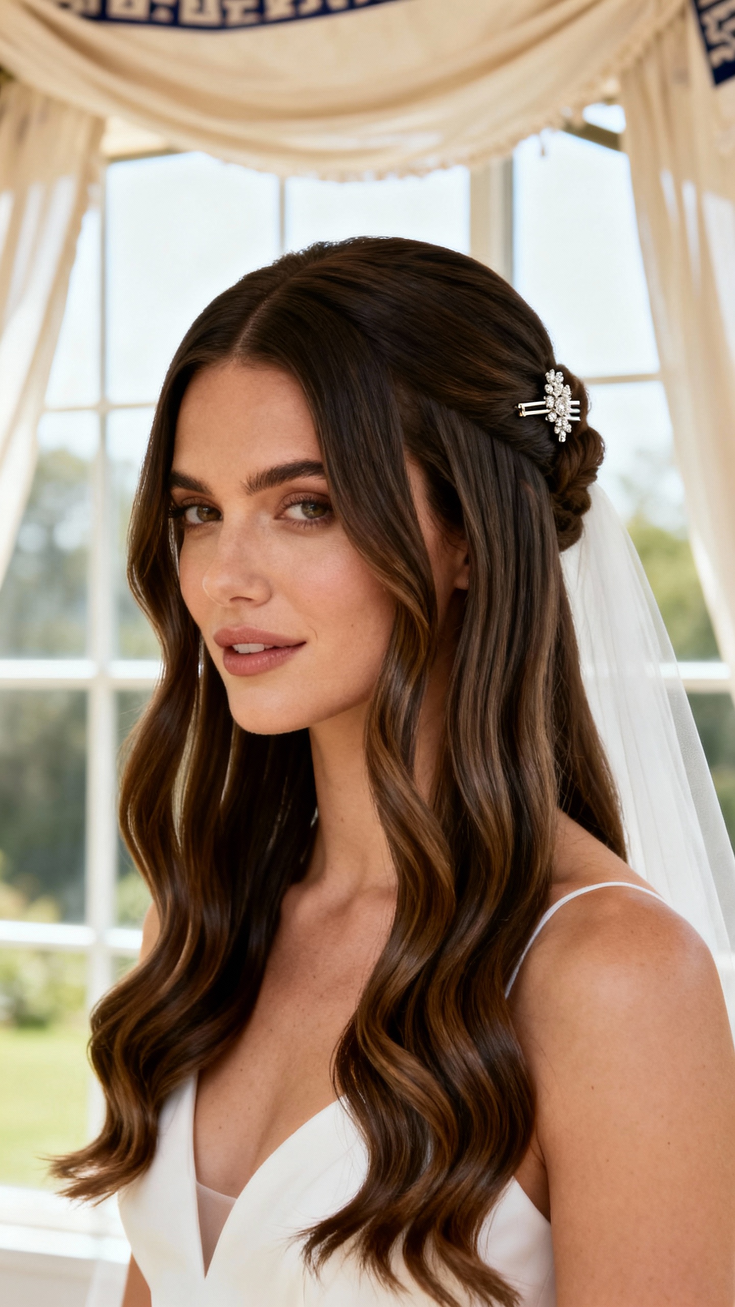 Half-up waves are perfect if you want your hair down but still want structure around your face for those close-up chuppah shots. It’s super flattering on oval and longer face shapes, and it gives that modern, effortless “polished but not stiff” look. Practical tip: place the veil under the half-up section (not on top) so it grips better and doesn’t slide when you turn your head during the ceremony.
