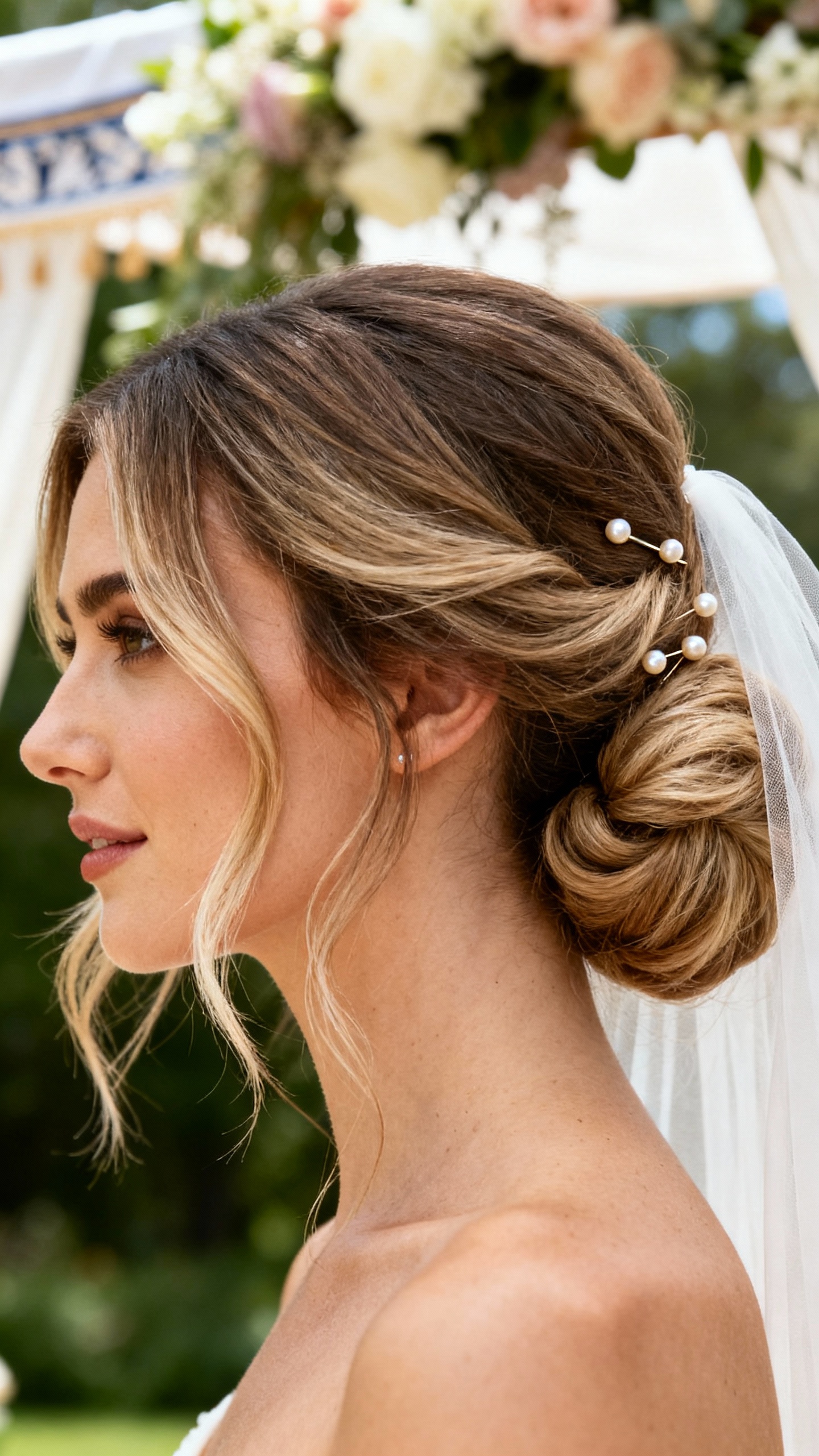 A low ponytail can be just as bridal as a bun—especially when the base is wrapped with hair and the front pieces are styled into soft S-curls that frame your face in photos. It flatters heart and oval face shapes, feels modern, and pairs perfectly with a clean veil or a bold hair accessory. Practical tip: add a few hidden pins at the sides of the pony base and mist a humidity-resistant spray through the mid-lengths so it stays smooth through the ceremony and outdoor portraits.