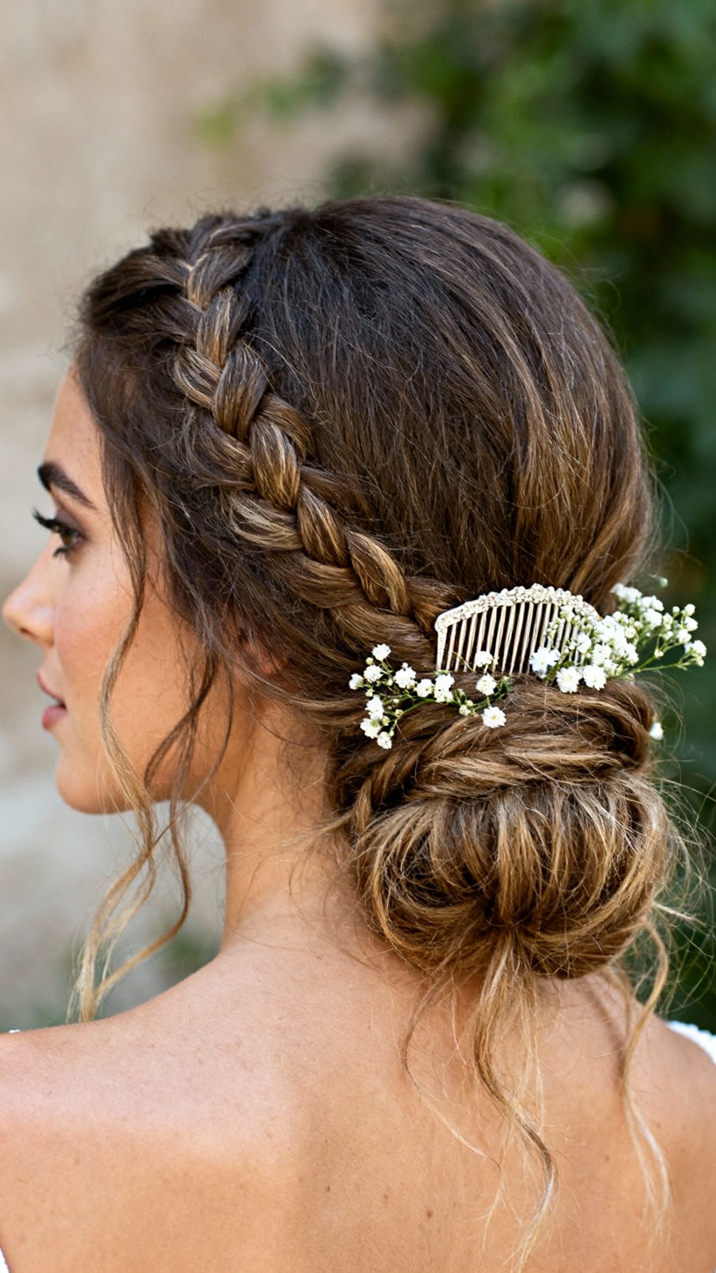 4) Braided Low Bun (Soft, Not Tight) with Baby’s Breath or a Dainty Comb