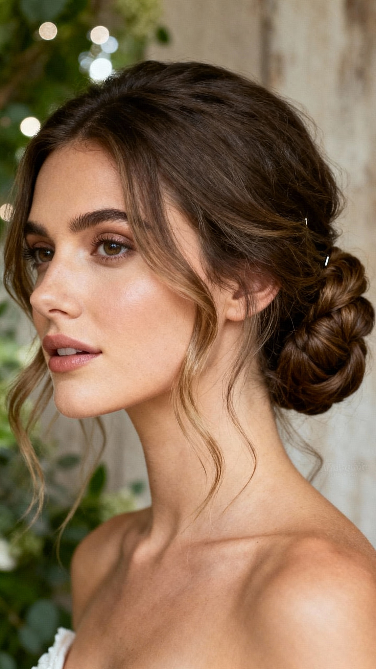 A braided low bun gives you that rustic detail without looking like you’re reenacting a farmhouse photoshoot. It’s super flattering for thick hair and anyone who wants a secure style that still looks soft and feminine. The vibe is romantic, slightly boho, and very “walks well down an outdoor aisle.” Practical tip: keep the braid chunky and relaxed (pancaked slightly) before you pin it into the bun—tight braids read sporty, while a loosened braid reads bridal; place a dainty comb just off-center for the prettiest asymmetry in photos.