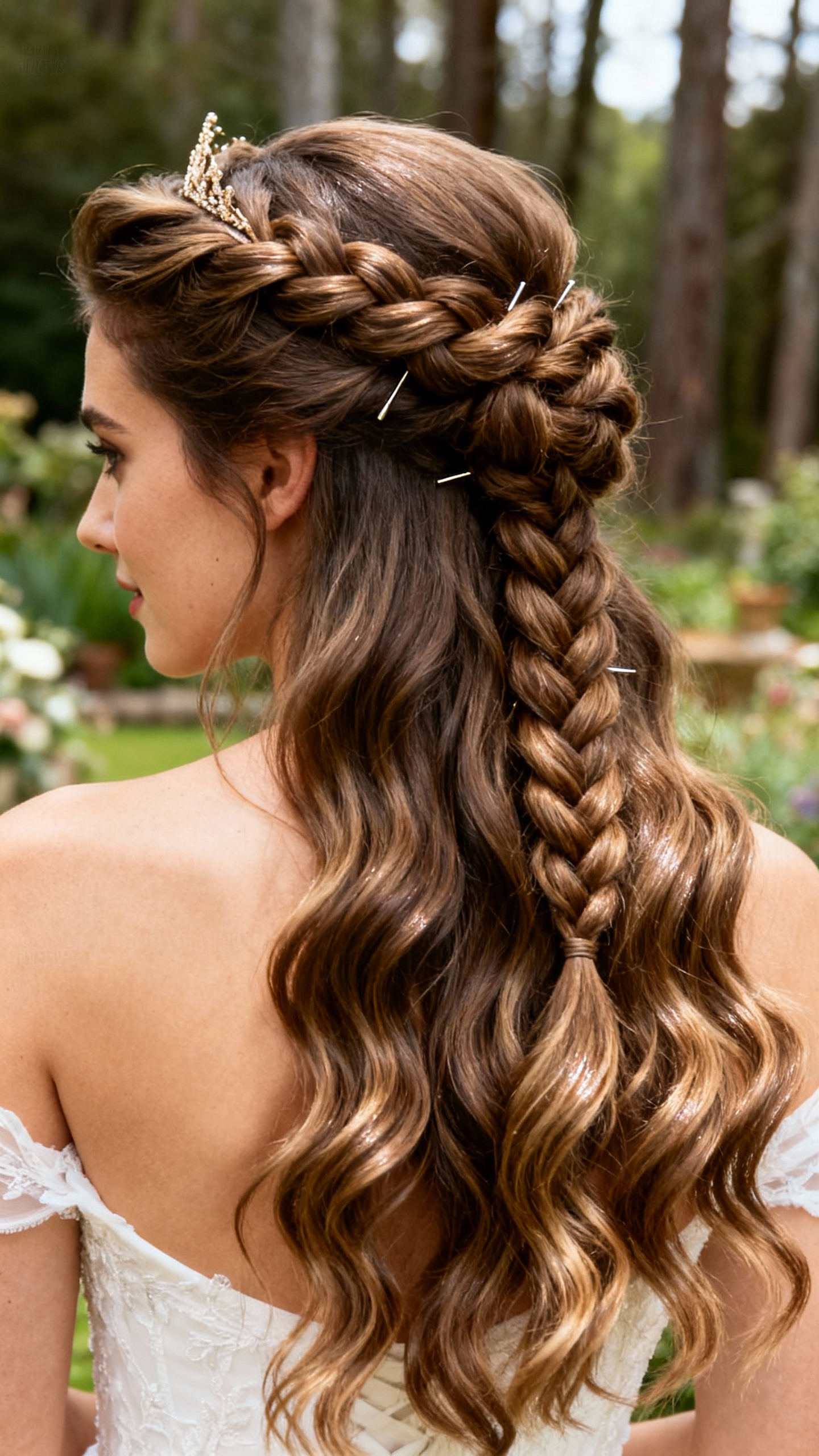 If you want “princess energy” but in a modern, outdoorsy way, a half-up twisted crown is the move. It’s especially flattering for brides with medium to long hair and anyone who wants a little lift at the crown without committing to a full updo. The vibe is whimsical and approachable—perfect with a flowy dress, lace sleeves, or a subtle sweetheart neckline. Practical tip: curl first, then twist and pin; finish with a light flexible hairspray so the waves stay bouncy (and don’t go crunchy in humid fields or vineyards).