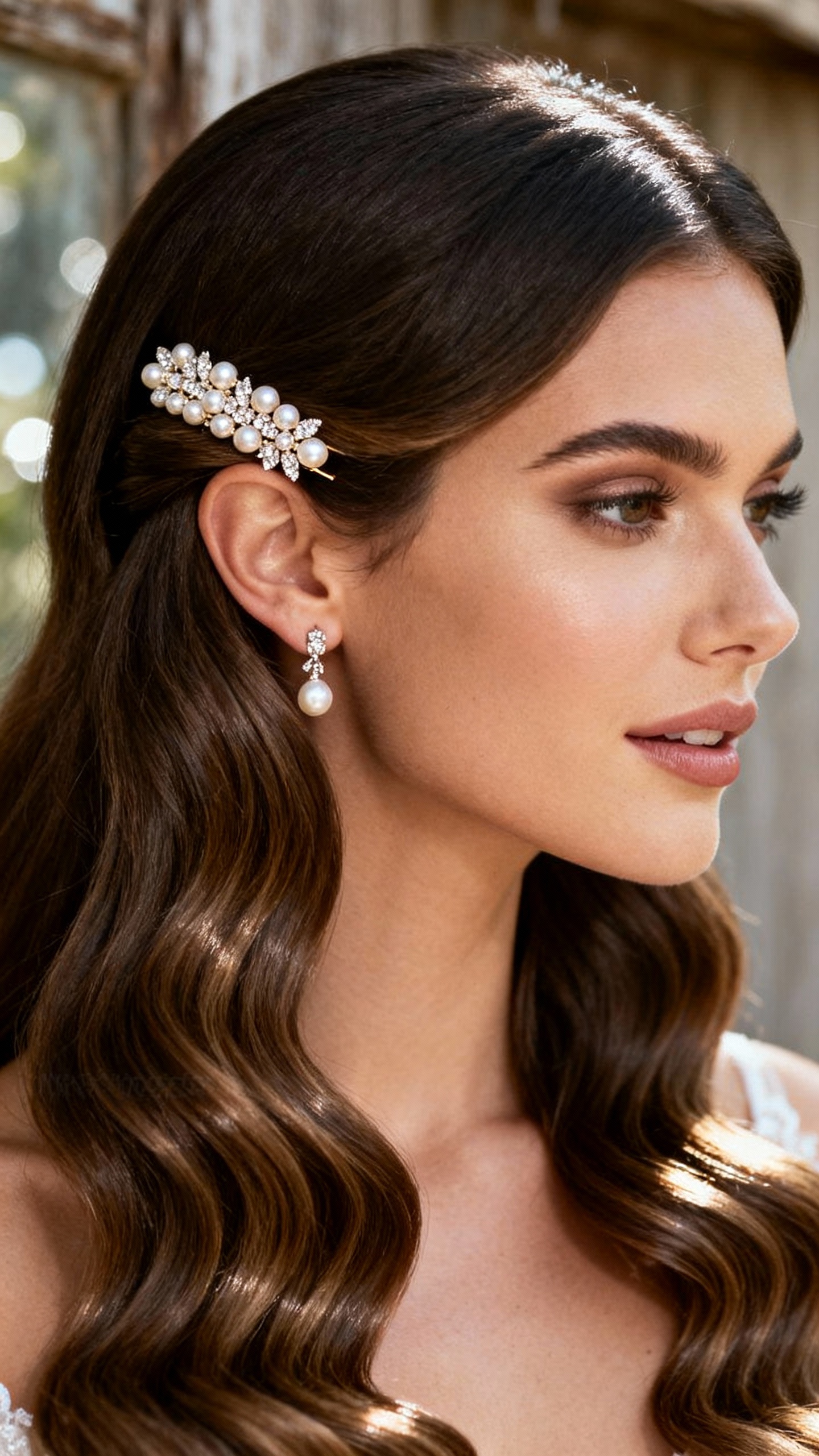 If you’re wearing your hair down, this is how you keep it rustic chic—not messy. Soft glam waves with one side tucked gives structure and shows off your face, earrings, and makeup while still feeling natural and touchable. It flatters round and heart-shaped faces because the side tuck opens the cheekbone area and creates a clean, lifted line. Practical tip: use a medium-barrel iron for bigger waves, then brush out and set with a light mist; secure the tuck with crisscrossed bobby pins under a pearl barrette or vintage-inspired clip so it stays put during hugs and wind gusts.