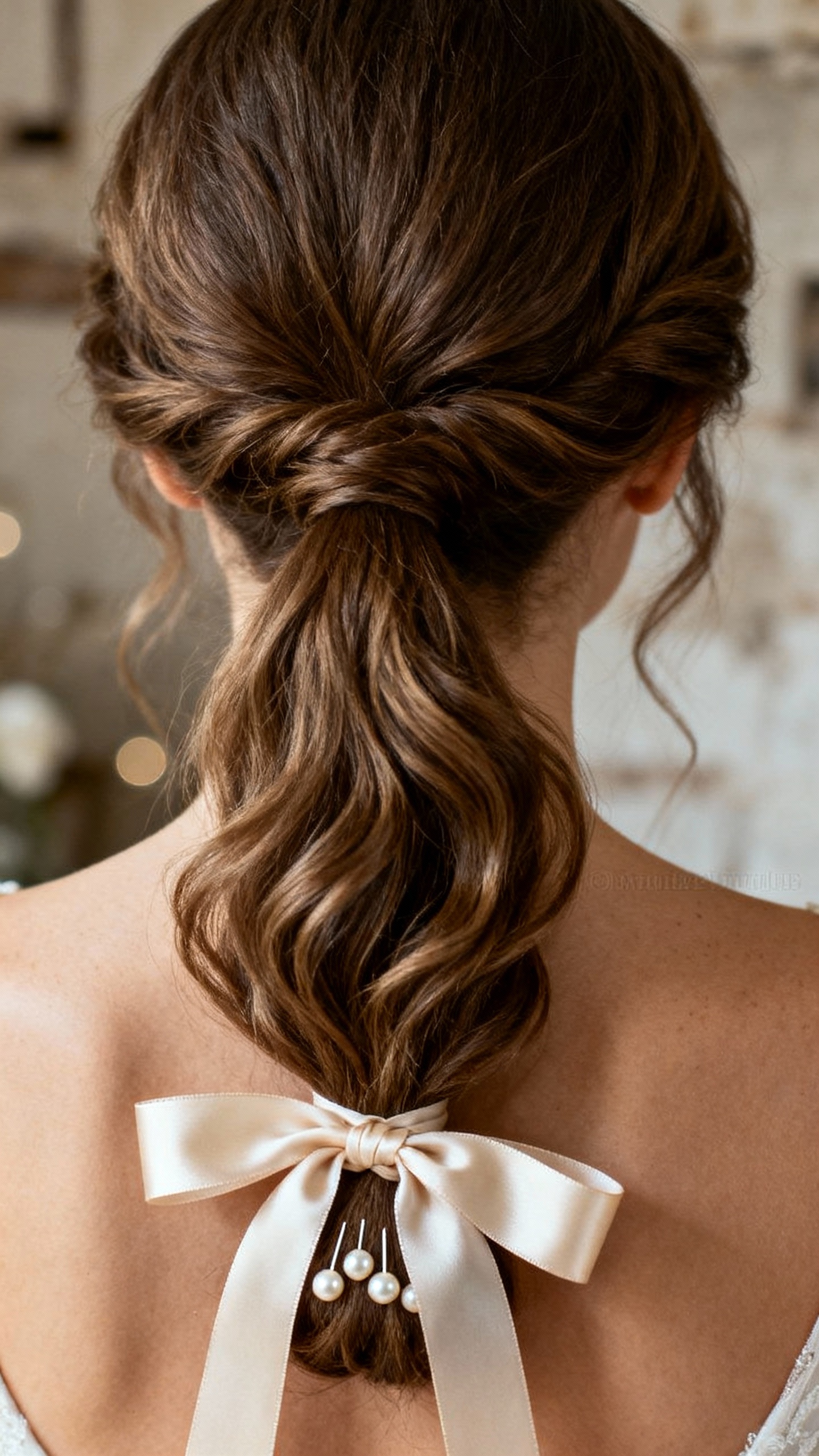 3) Low Ponytail with Volume and Ribbon or Pearl Pins