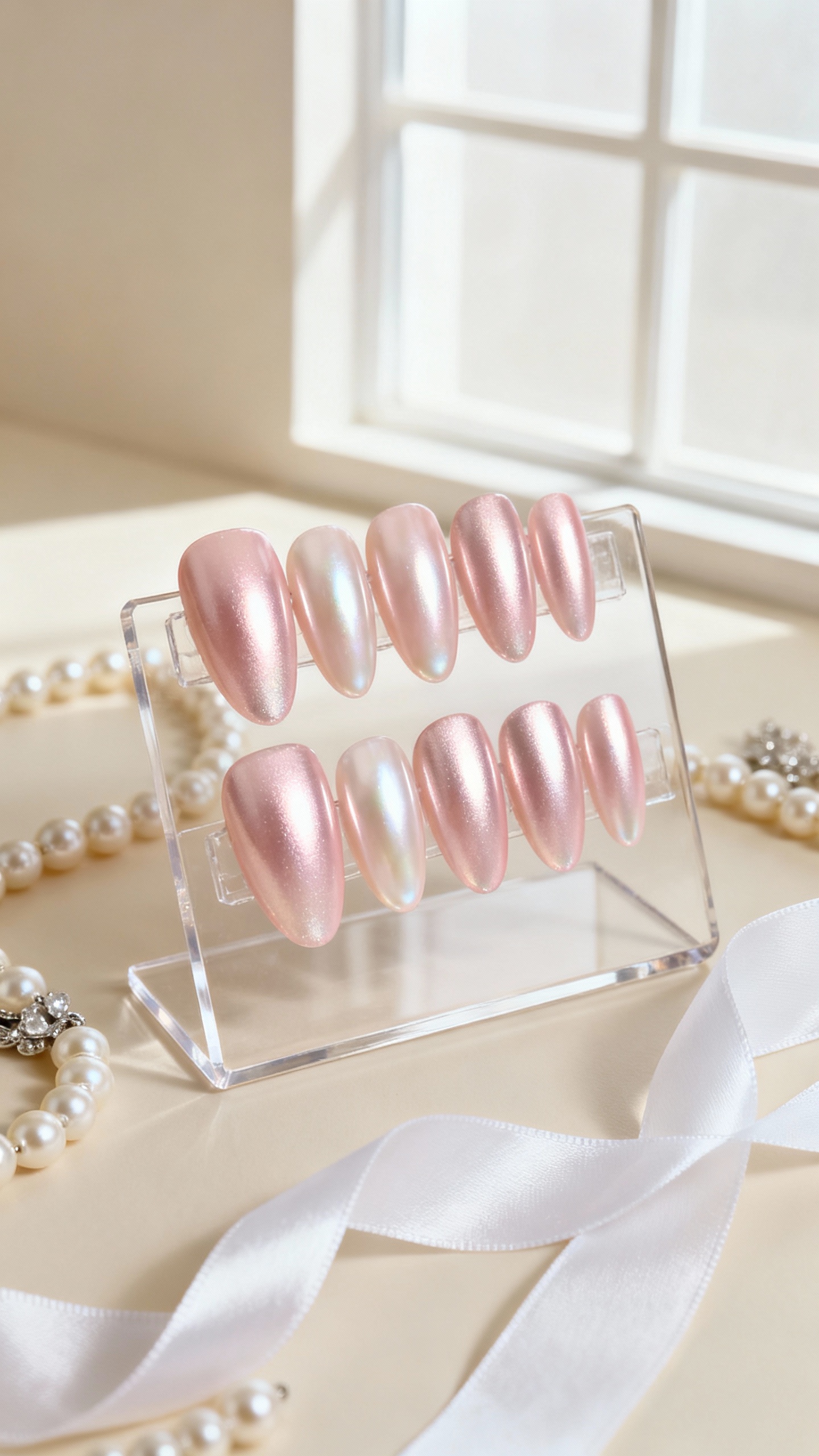 Think soft pink with a pearly glaze that catches light but still reads clean and bridal—perfect for brides, bridesmaids, and even moms who want something special. Go for almond or medium oval to elongate the fingers, and choose a smooth chrome finish sealed with a glossy top coat for stain resistance. Photo tip: avoid yellow indoor lighting; step near a window or outdoors in shade so the pearl sheen looks creamy, not brassy.