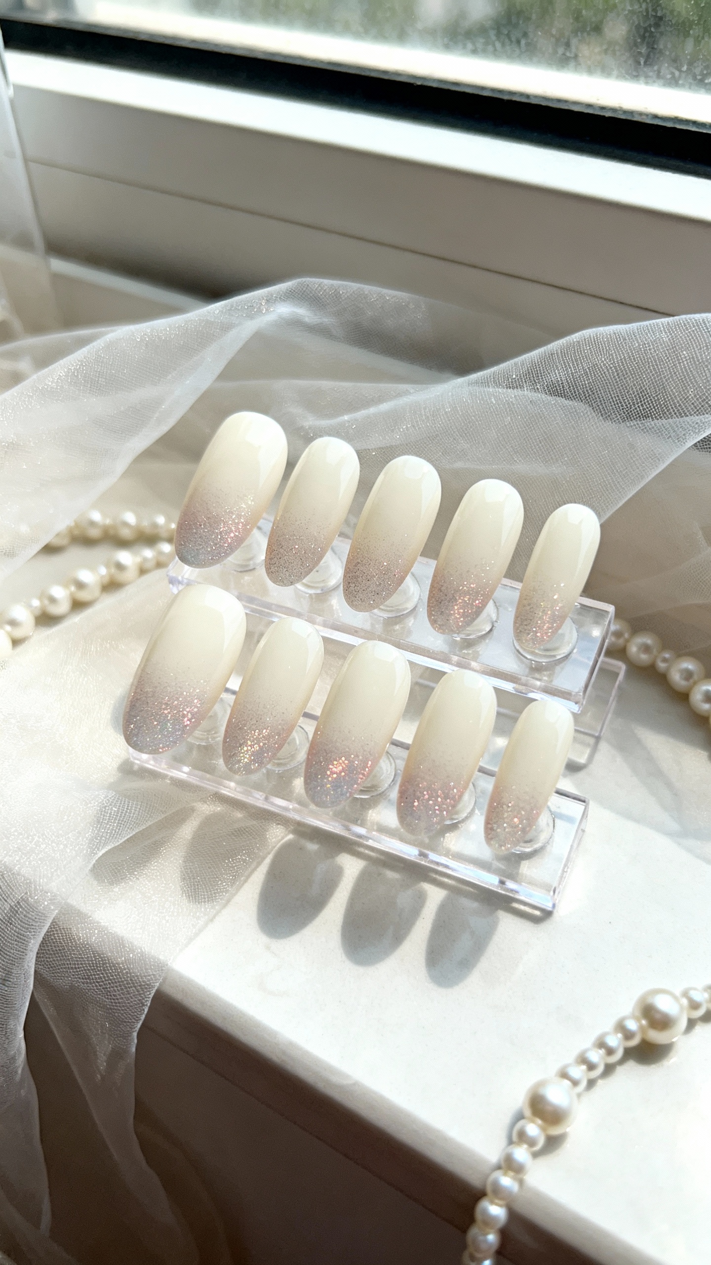 A milky ivory base with a soft glitter fade near the cuticle looks dreamy and, bonus, it camouflages any micro-growth or wear through the day. Choose short almond or oval to keep the sparkle looking delicate, and stick with a glossy finish so it reads like twinkle instead of texture. Photo tip: for ring shots, tilt your hand slightly so the glitter catches light—flash photos love this one.