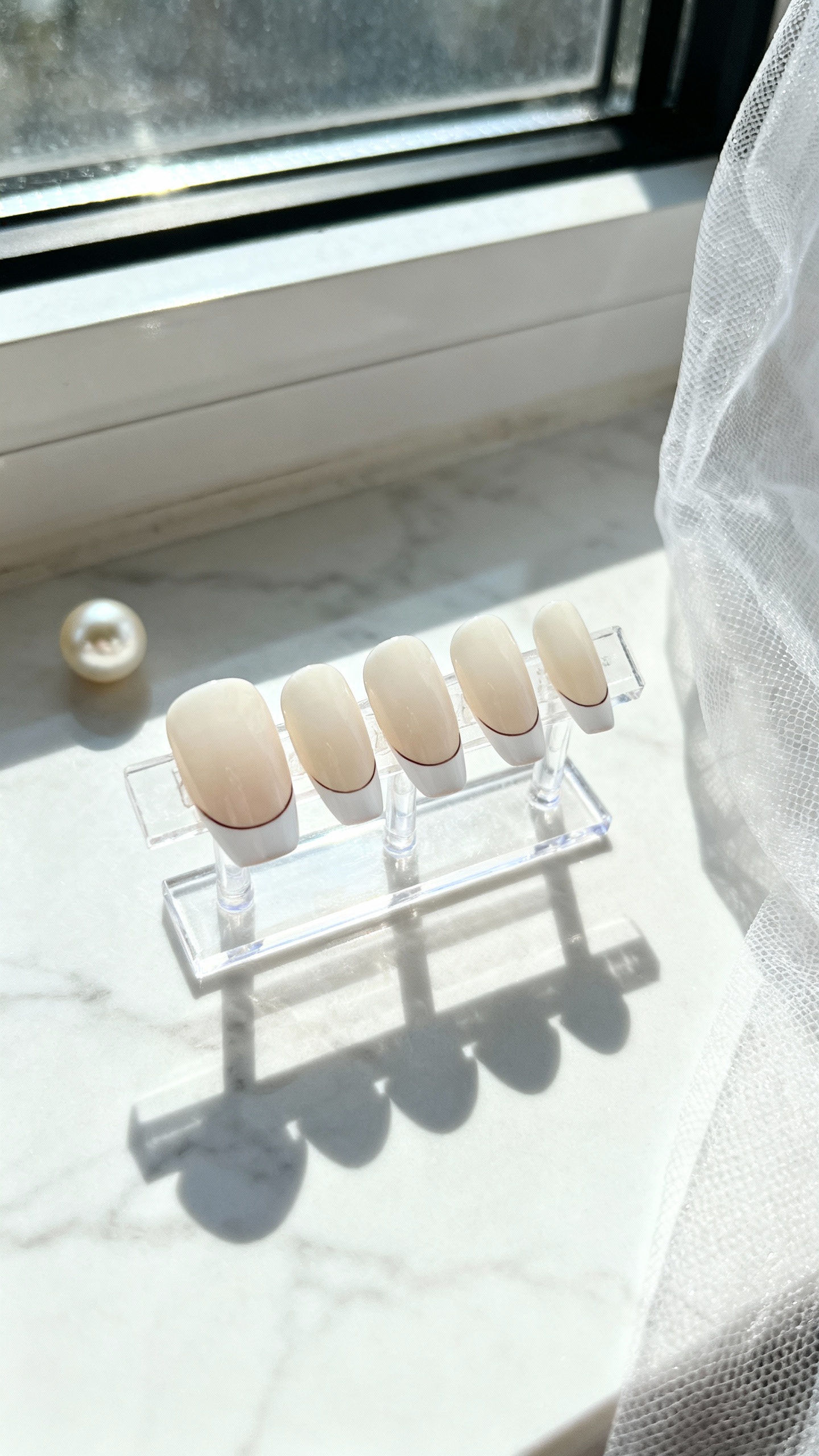 This is the ultimate low-stress wedding nail: a neutral beige base that’s slightly sheer with a super glossy “lip gloss” finish that hides tiny imperfections. A short squoval shape is the most practical for handling zippers, buttons, and bouquet stems without chipping. Photo tip: shoot your hands against a white robe, veil, or invitation suite—clean backgrounds make the glossy finish look intentional and polished.