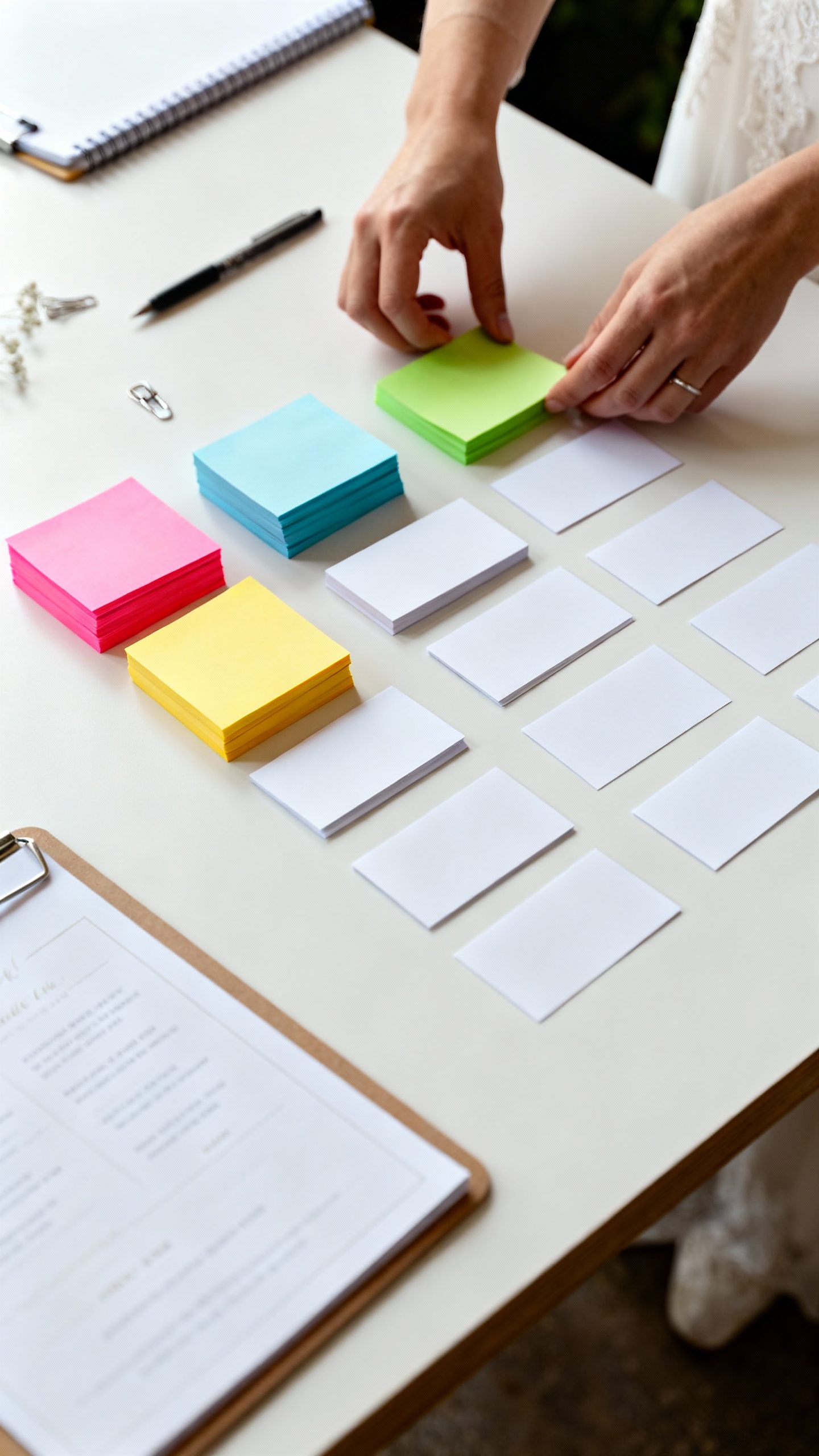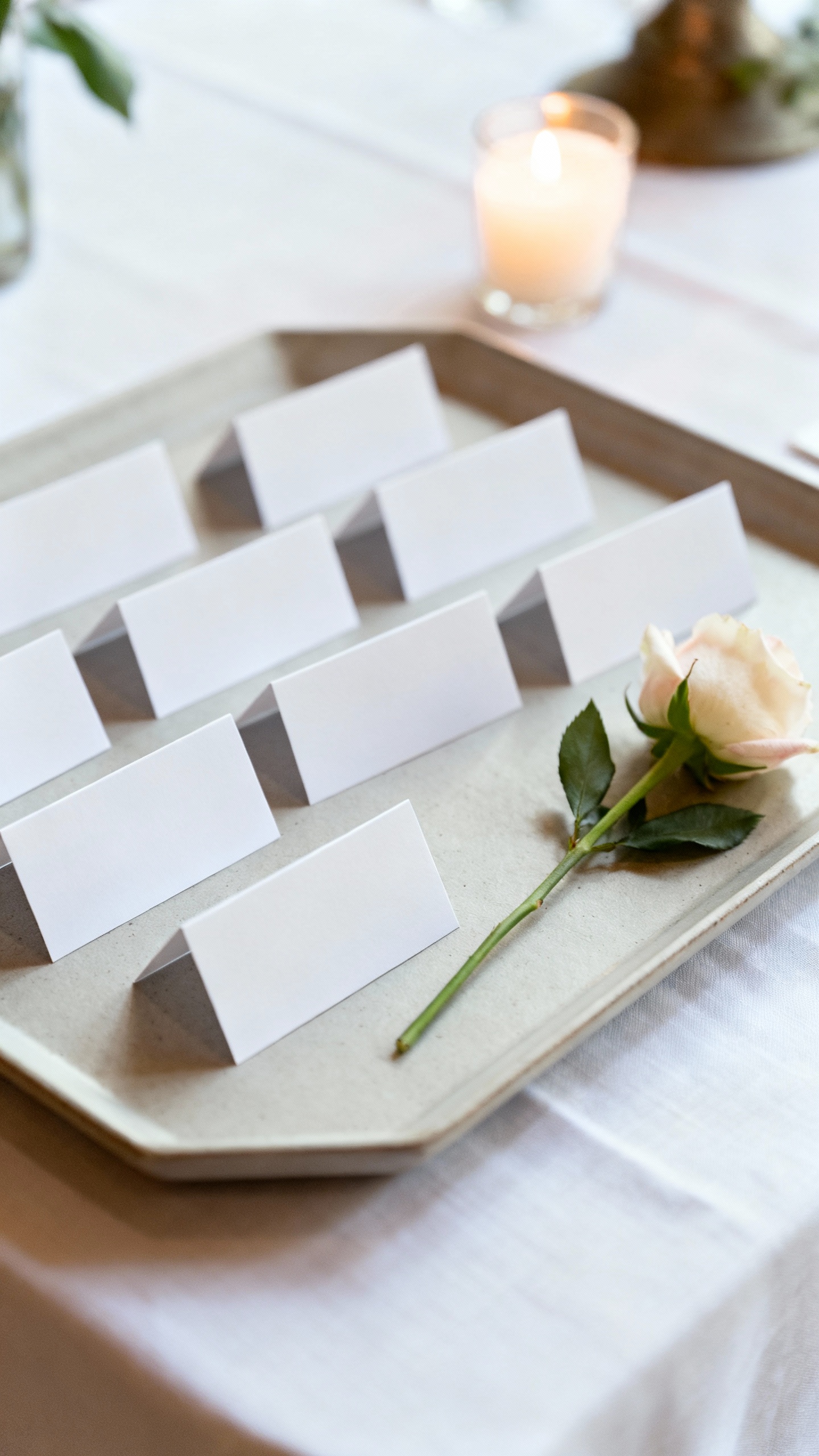 Decide if you want escort cards (name + table number) or a seating chart (everyone listed by table). Escort cards can feel more personal and spread guests out as they enter, while a seating chart can be faster and more streamlined for larger weddings. Whichever you choose, prioritize legibility: high contrast text, alphabetical ordering, and a display location with good lighting.