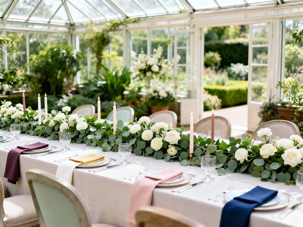 Start with your venue and season, then decide if you want your look to feel light (ivory, champagne, sky blue) or dramatic (navy, plum). Greenery is your neutral base, so pick one main color to lead and one supporting tone to keep things cohesive. When in doubt, pull your palette from your favorite floral inspiration photo and match your linens to that.