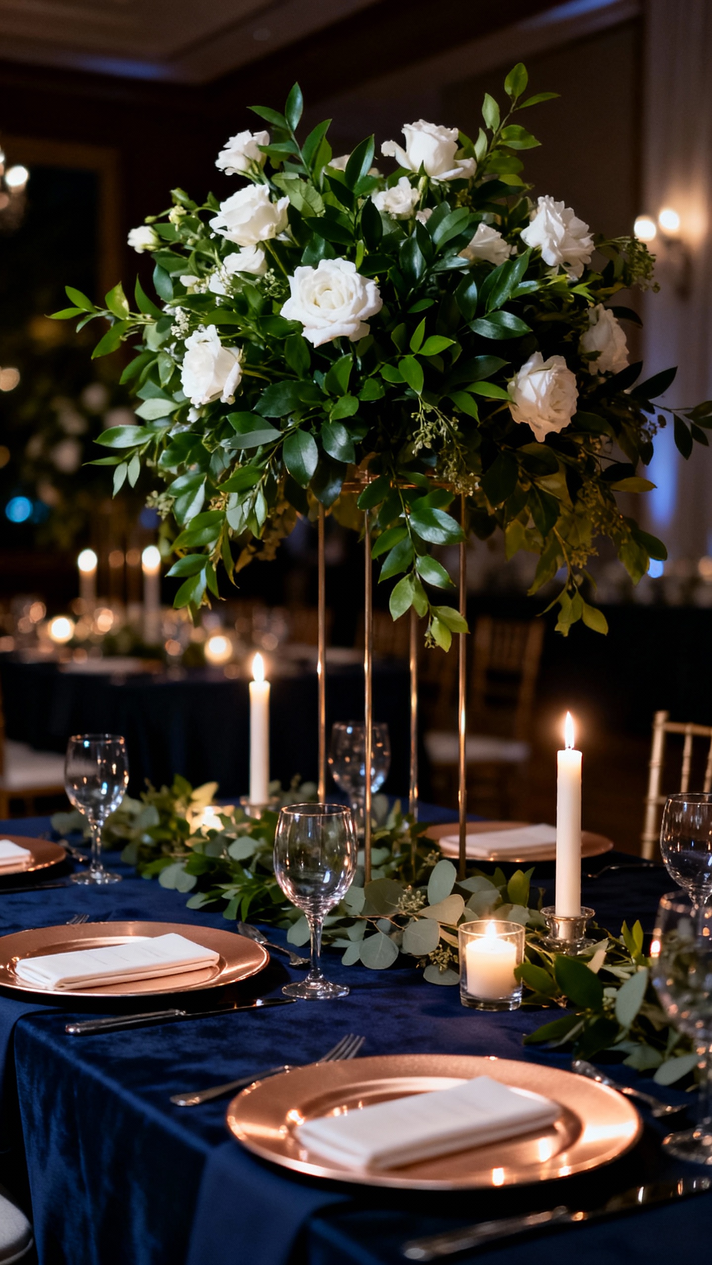 Navy is a power color that makes green foliage look richer and more dramatic, especially in evening or indoor weddings. Champagne softens the contrast so it still feels wedding-y, not corporate. Use navy in suits, table numbers, or velvet details, and keep champagne for metallic touches, chargers, and satin ribbons.
