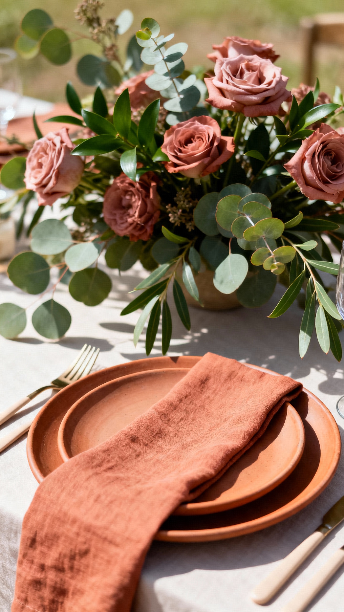 If you want romantic but not overly sweet, dusty rose with terracotta is the move. The warm clay tone makes greenery look extra fresh, and blushy florals feel modern against it. Try terracotta napkins or taper candles, then layer dusty rose in bouquets, signage, and bridesmaid looks.