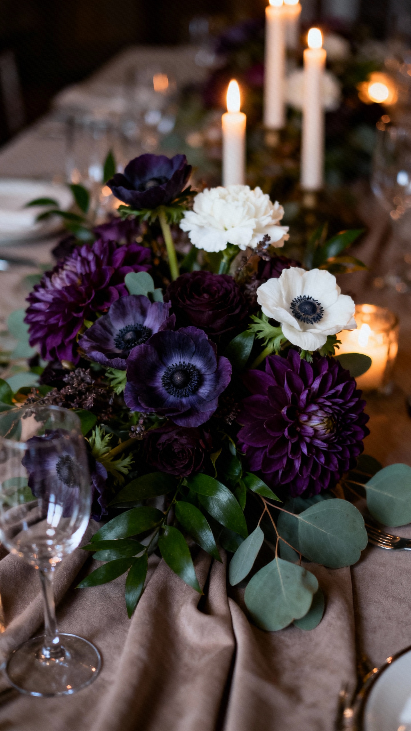 For a fall or winter vibe that still feels romantic, plum plus taupe is a gorgeous match for greenery. Deep purples make white florals look luminous, and taupe adds softness so the palette doesn’t go too gothic. Try plum in candles or bridesmaid dresses, then use taupe for linens and signage to keep the look grounded.