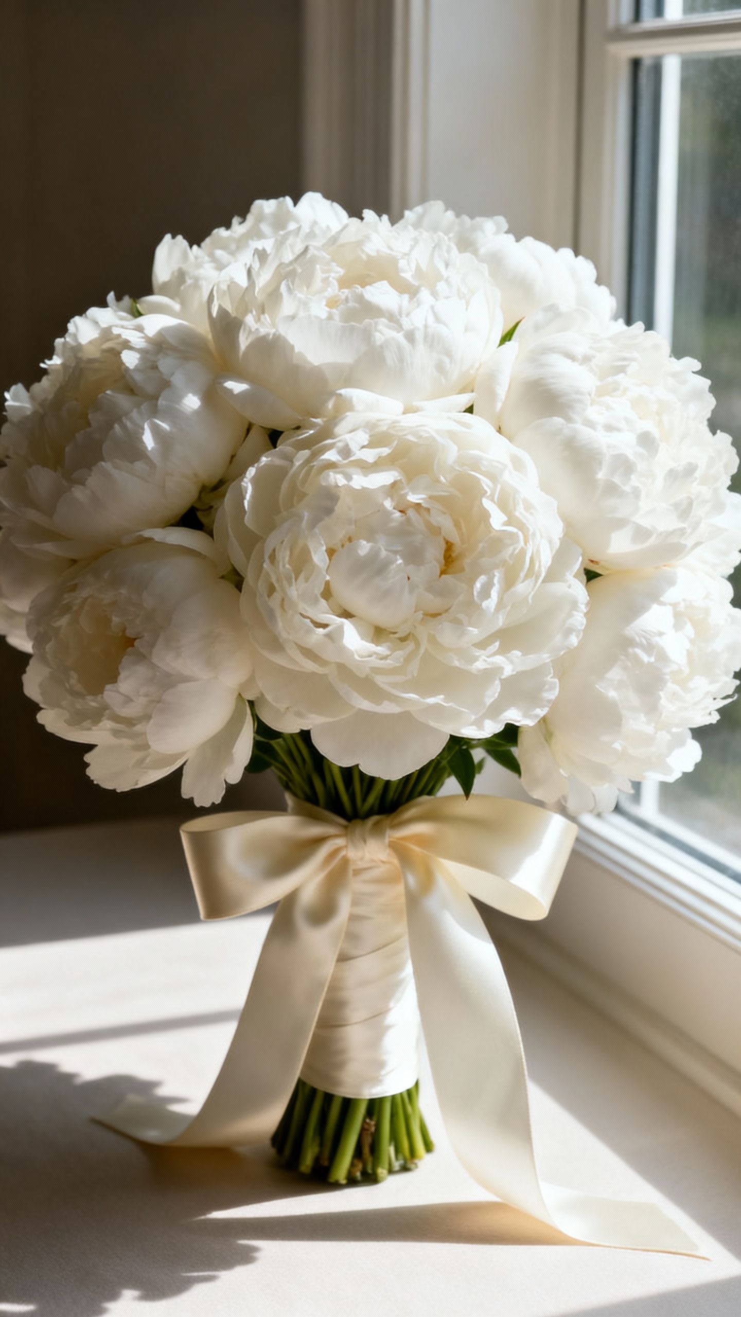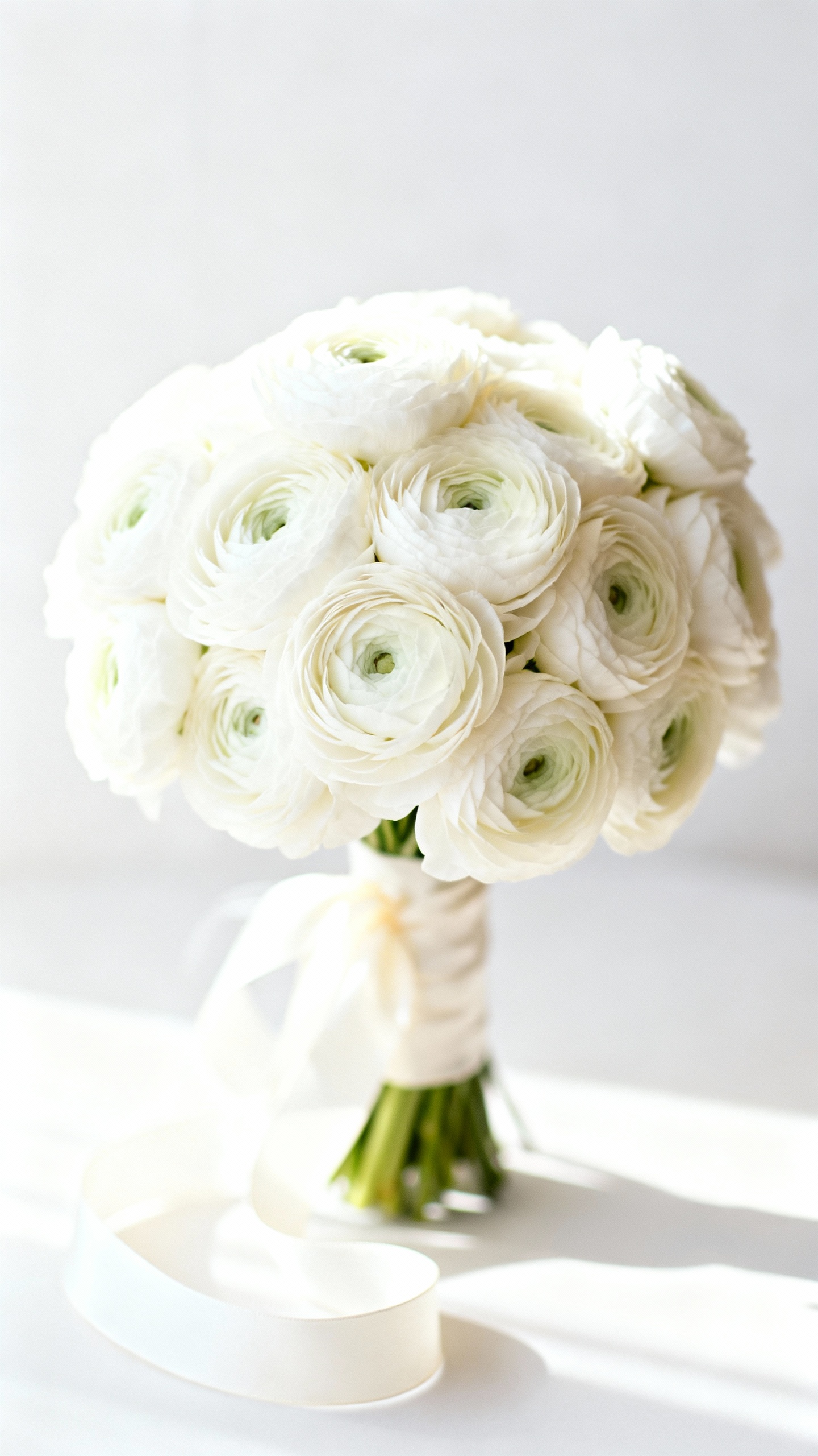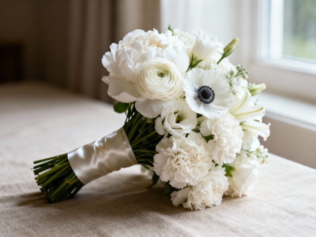 Focus on shape and palette: a rounded or softly cascading bouquet in a clean white/ivory mix will read timeless no matter the flower. Ask for a blend of big focal blooms (like peonies or ranunculus) plus softer fillers (like lisianthus) to mimic the depth roses usually give. Finish with a satin ribbon for that traditional bridal polish.