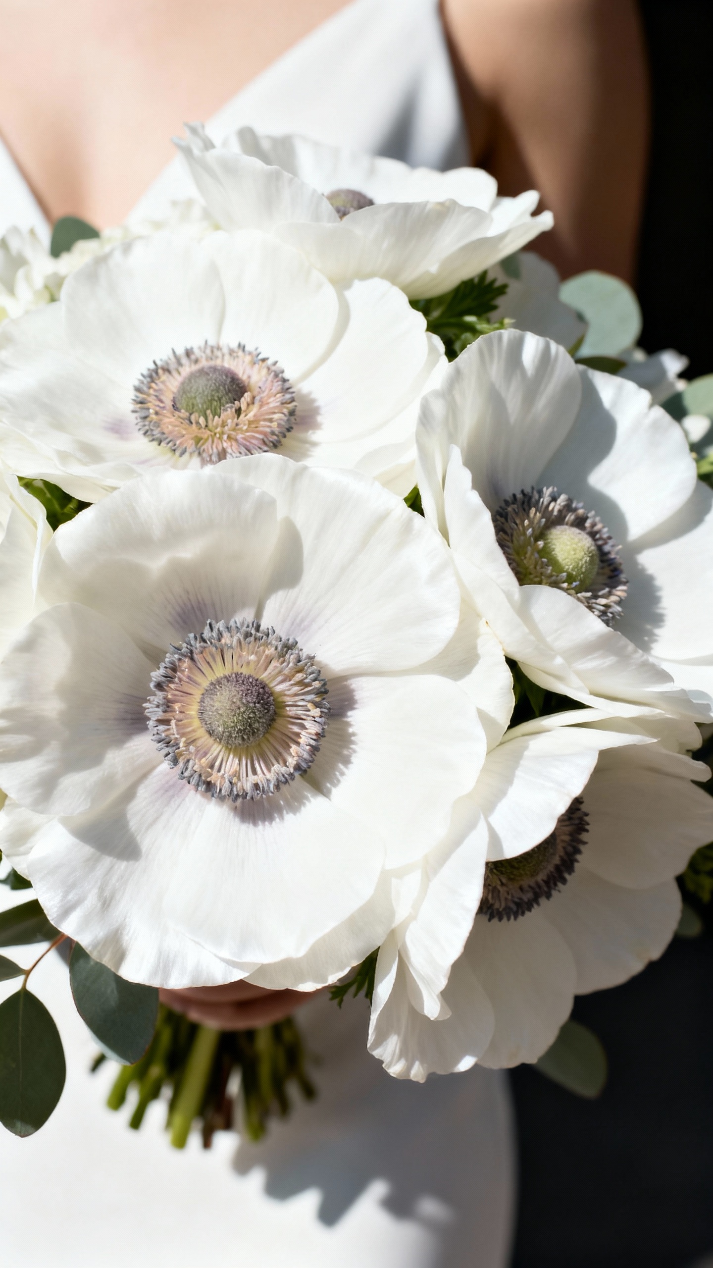 Anemones are for the bride who wants classic white, but with a little pop that reads high-fashion. They’re known for their dark centers, but you can ask your florist about varieties with softer centers or have them balanced with plenty of white blooms so it stays bridal. They look stunning in modern bouquets with structured greenery like Italian ruscus. Bonus: they instantly add contrast, which makes your bouquet stand out in photos against a white dress.