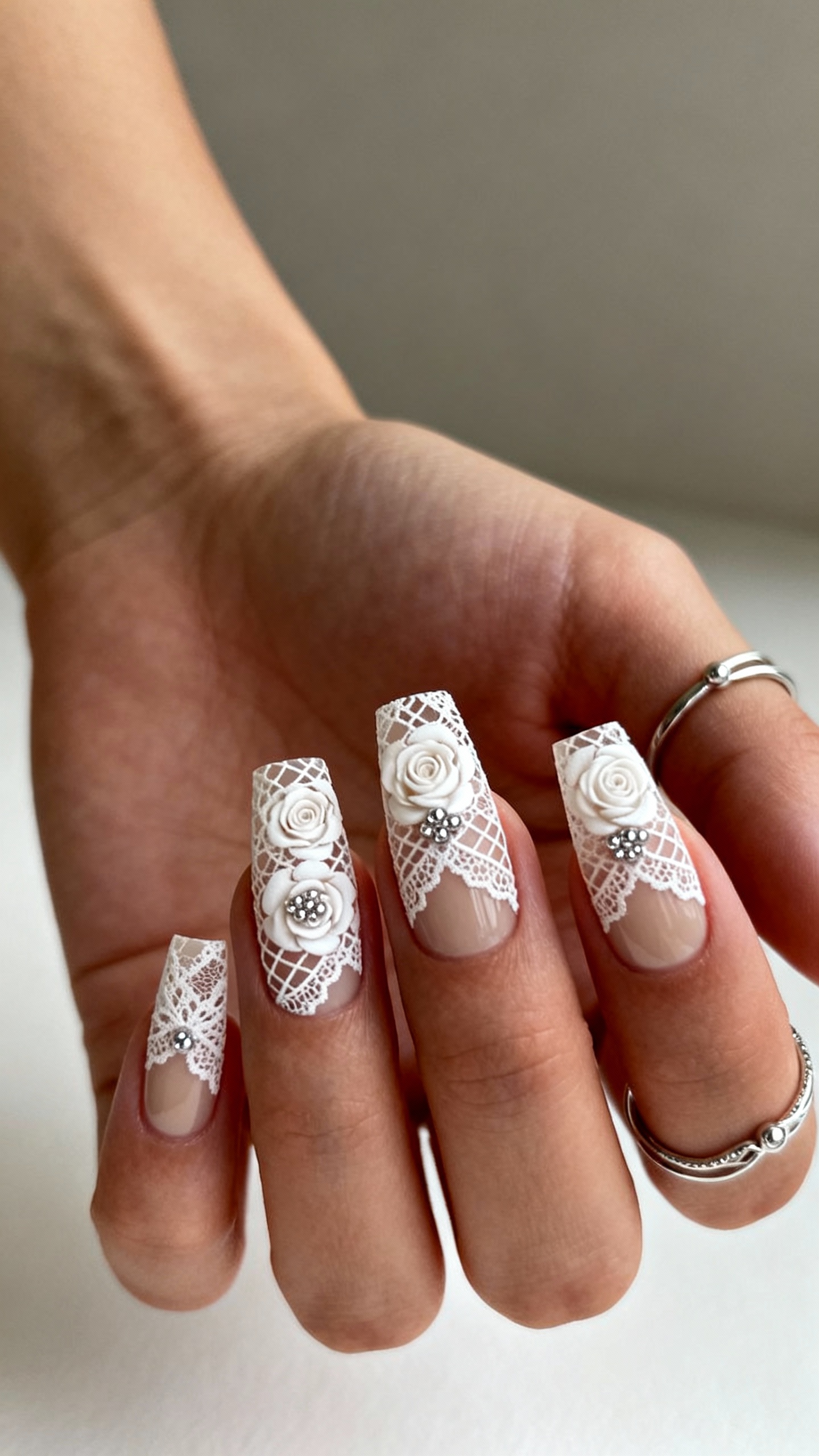 This one is for the detail lovers: fine white rose-and-lace linework layered over a sheer nude base, finished with tiny silver caviar beads or micro-studs as flower centers. The cool metallic points echo silver jewelry and give the whole look a clean, sparkly “bridal accessory” moment without full glitter. A short almond or short squoval keeps it elegant and wearable (and less likely to snag). Wear tip: if you’re using beads, ask for encapsulation with a thicker top coat or a thin builder layer so the studs don’t pop off mid-wedding weekend.