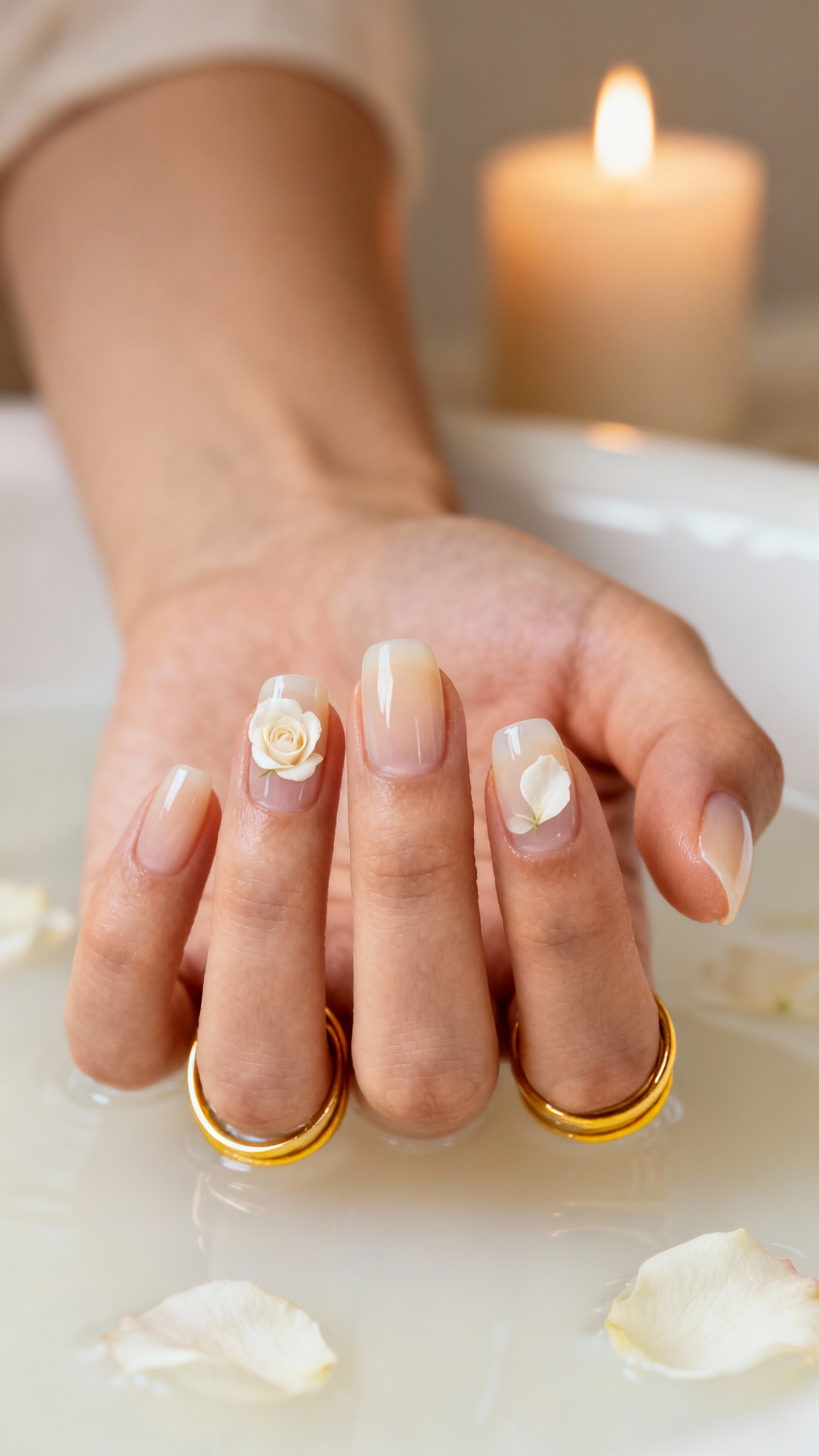 This look is a sheer ivory “milk bath” base with soft white rose petals floating across a couple accent nails—super romantic, almost candlelit. The warm undertone makes gold rings and bangles look extra rich and glowy. Go for almond or oval in short-to-medium length for that timeless bridal feel. Wear tip: choose builder gel or a structured gel overlay so the translucent base doesn’t flex and crack, and seal the free edge to help prevent tip chipping.