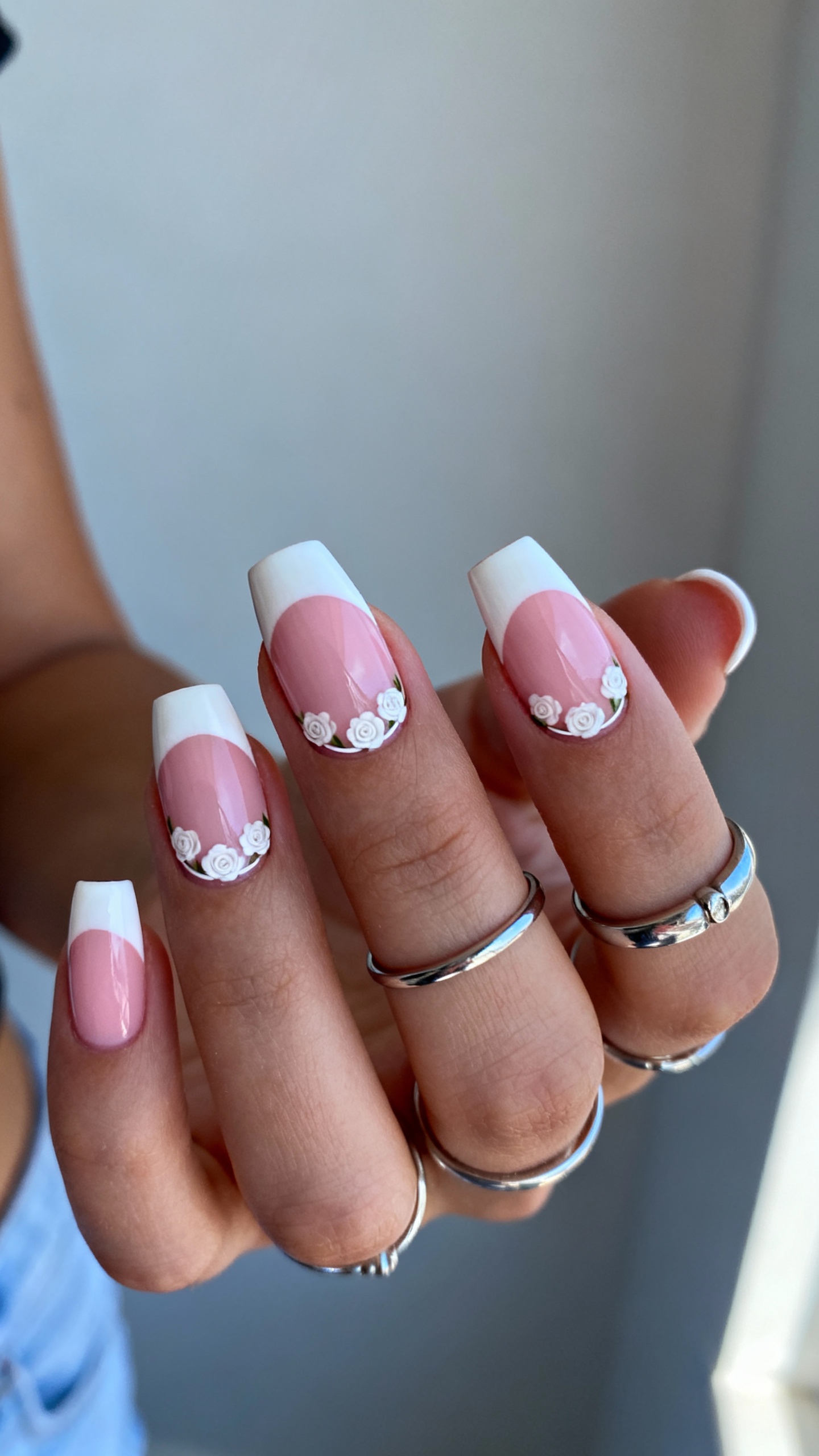 A classic French gets upgraded with tiny hand-painted white rose clusters sitting right at the smile line, over a cool blush-pink base. The clean contrast and cooler pink undertone make silver jewelry look icy, bright, and super polished in photos. This is gorgeous on square or squoval, medium length, especially if you want a modern, editorial vibe. Wear tip: ask your tech for a thin, even top coat (no bulky edges) so the French line stays sharp and the roses don’t snag on lace or tulle.