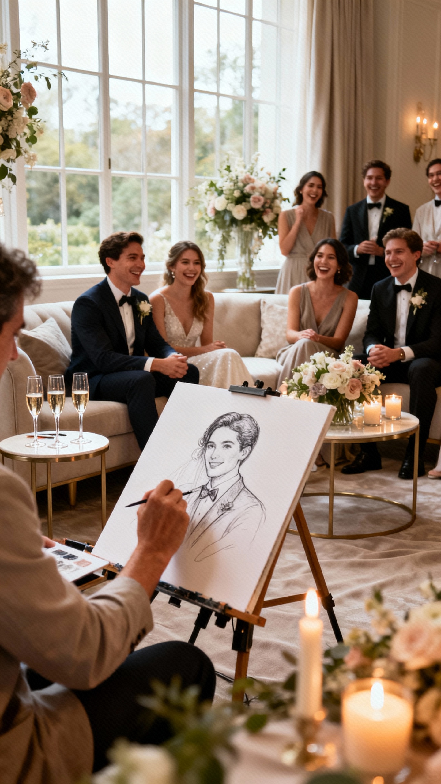 Hire a live sketch artist, watercolor painter, or digital illustrator to create quick portraits. Guests get a keepsake they’ll actually take home (and post).