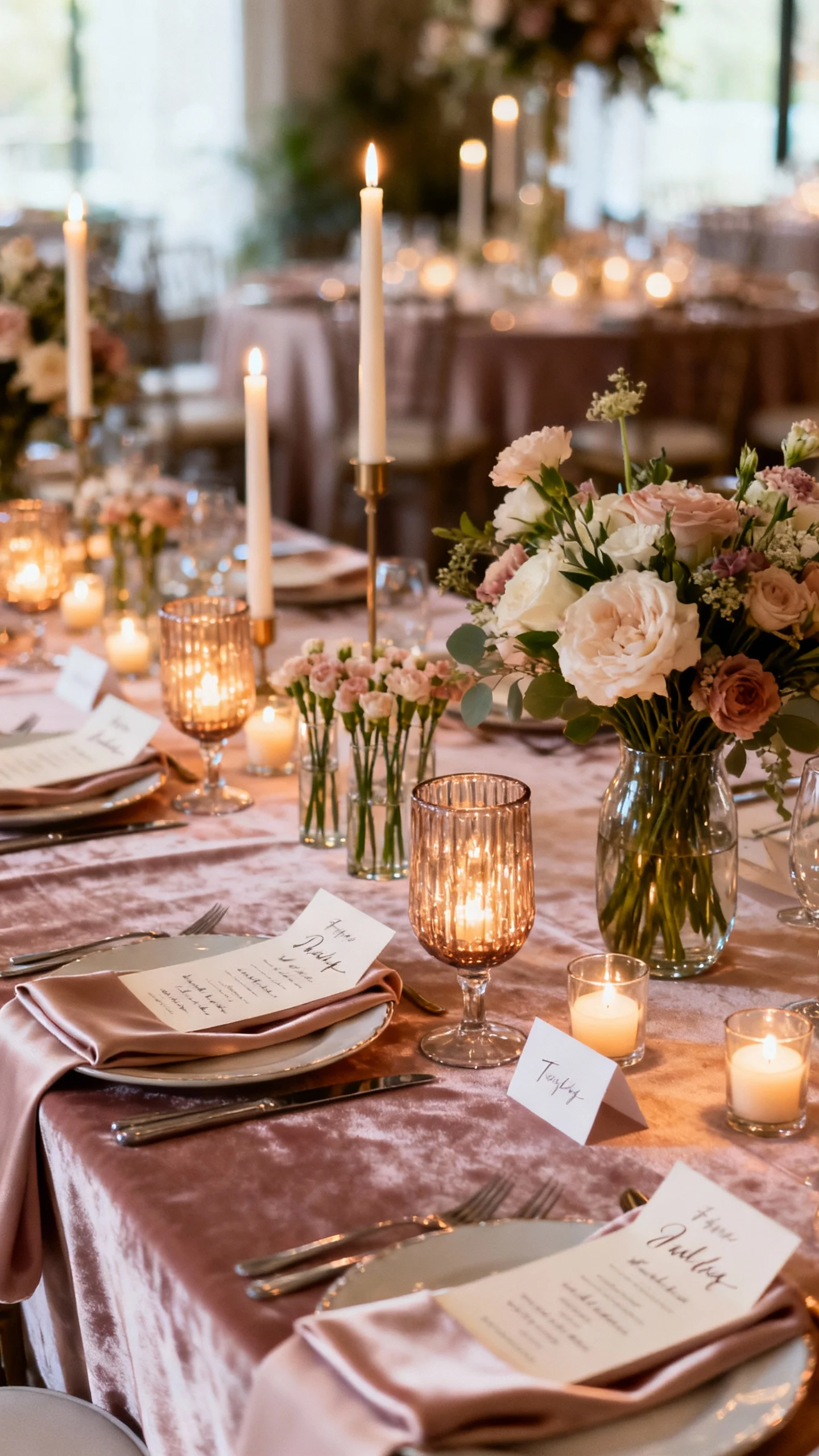 Build romance at the tables with layered lighting: taper candles, votives, and a few statement hurricanes. Choose linens with a slight sheen or texture (like satin or a soft matte velvet) to elevate even simple centerpieces. Use bud vases plus one larger arrangement per table to stretch florals without looking sparse. Finish with handwritten place cards and a delicate menu card for a “love letter” feel.