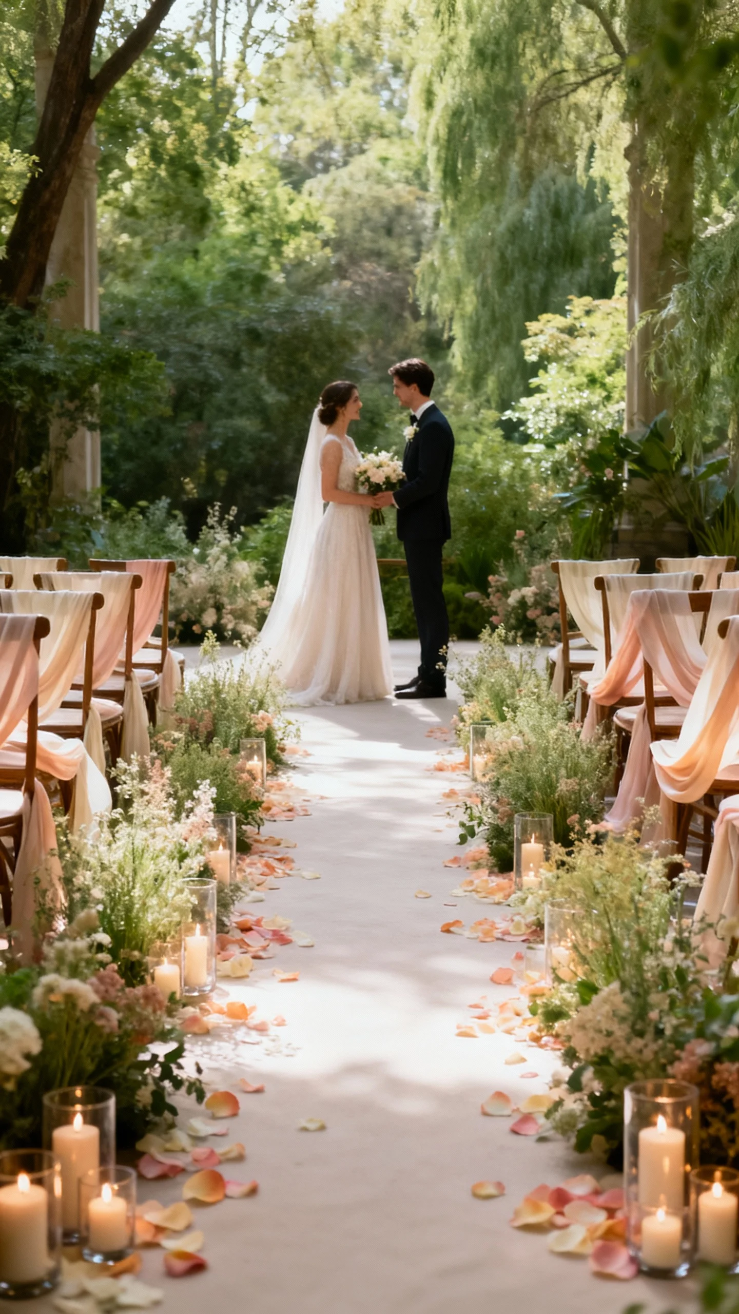 For a romantic vibe, focus on soft shapes, gentle color, and texture that feels airy. Line the aisle with low meadow arrangements, candle clusters in hurricanes, or petals in a subtle ombré. Add a simple fabric drape on chairs or pews to create movement in photos. Keep the palette cohesive—blush, ivory, and warm greens work almost anywhere.