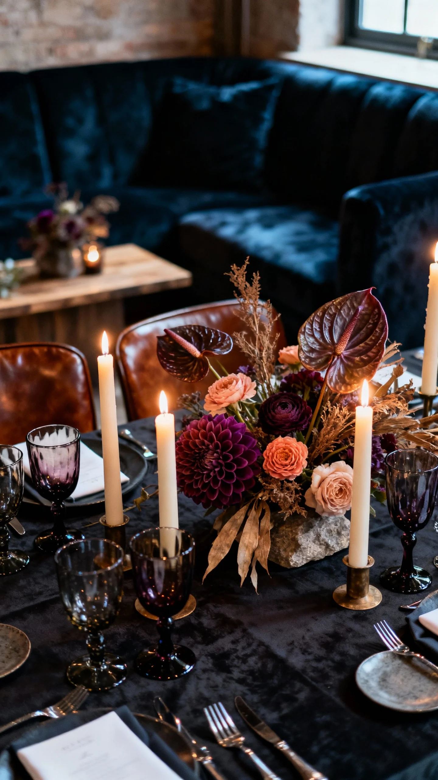 Set moody reception tables with dark linens, smoky glassware, and lots of flickering light. Cluster candles in varied heights, then add florals with texture—dahlias, anthurium, ranunculus, or dried elements for dimension. Incorporate wood, leather, or stone details to keep it tactile and cozy. A late-night lounge corner with velvet seating and low tables seals the vibe.