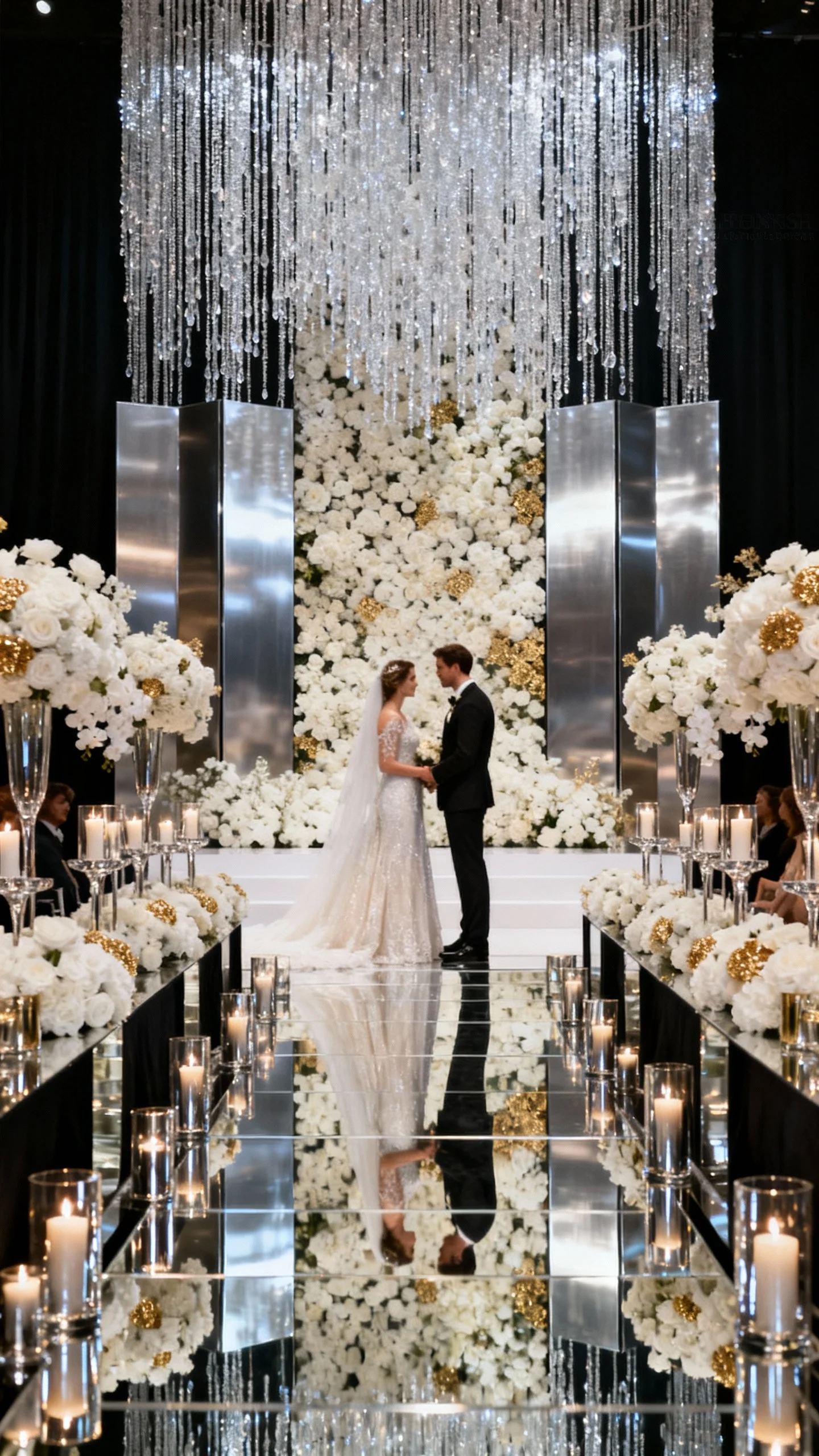 For glam, lean into shine, symmetry, and elevated scale. Create a polished aisle with mirrored accents, reflective candleholders, or sleek white florals with hints of gold. A dramatic ceremony backdrop—think crystal strands, metallic panels, or a floral wall—sets the tone instantly. Keep the palette tight (white, black, champagne, or jewel tones) so it reads luxurious instead of busy.