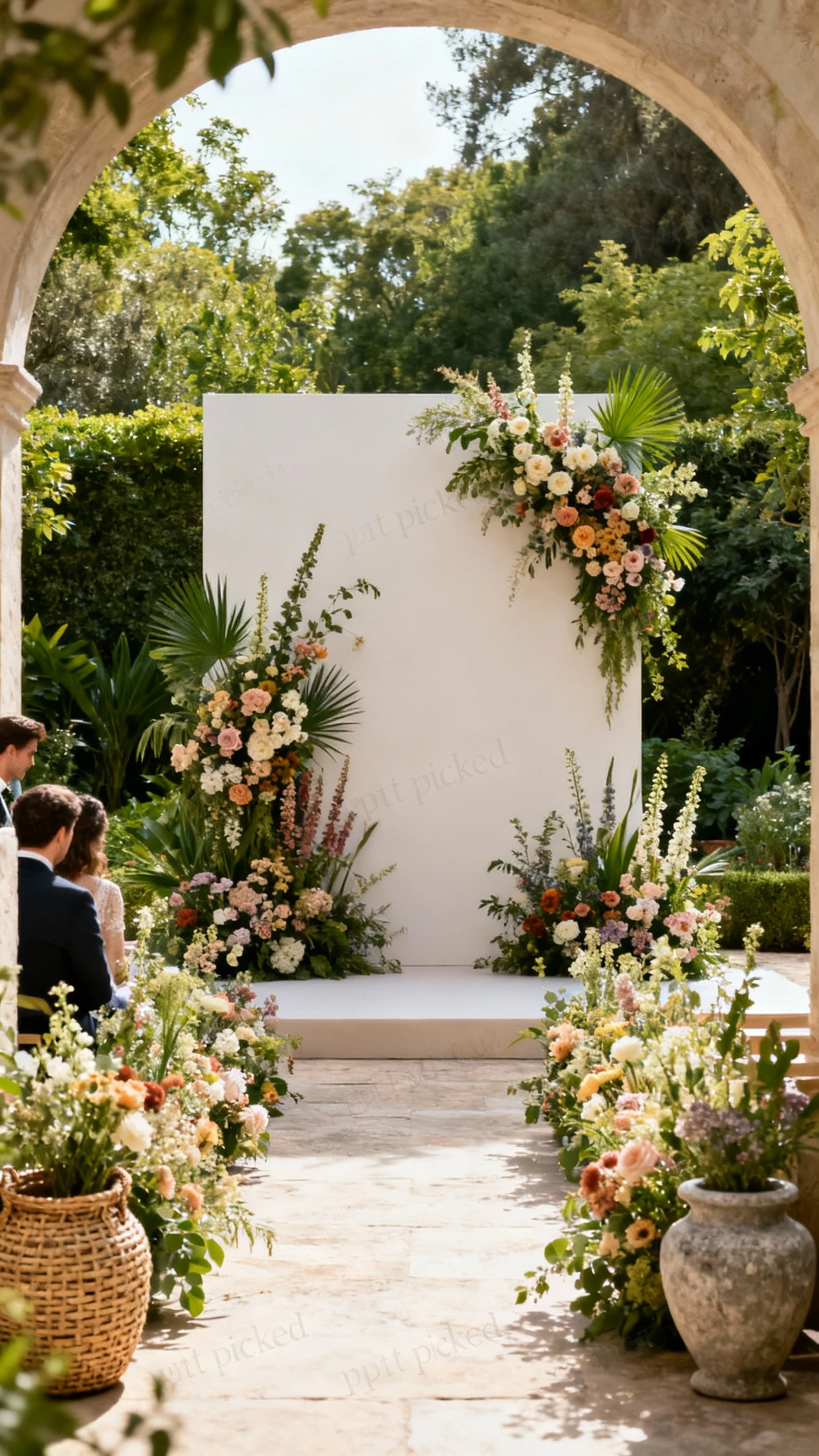 A garden vibe is all about organic layers and “just picked” energy. Use mixed blooms and foliage in varied heights, and don’t be afraid of asymmetry on the ceremony backdrop. If your venue has greenery, frame it rather than covering it—think floral corner sprays, aisle clusters, and a grounded arch. Add woven baskets or stone urns for a charming, outdoor-forward touch.