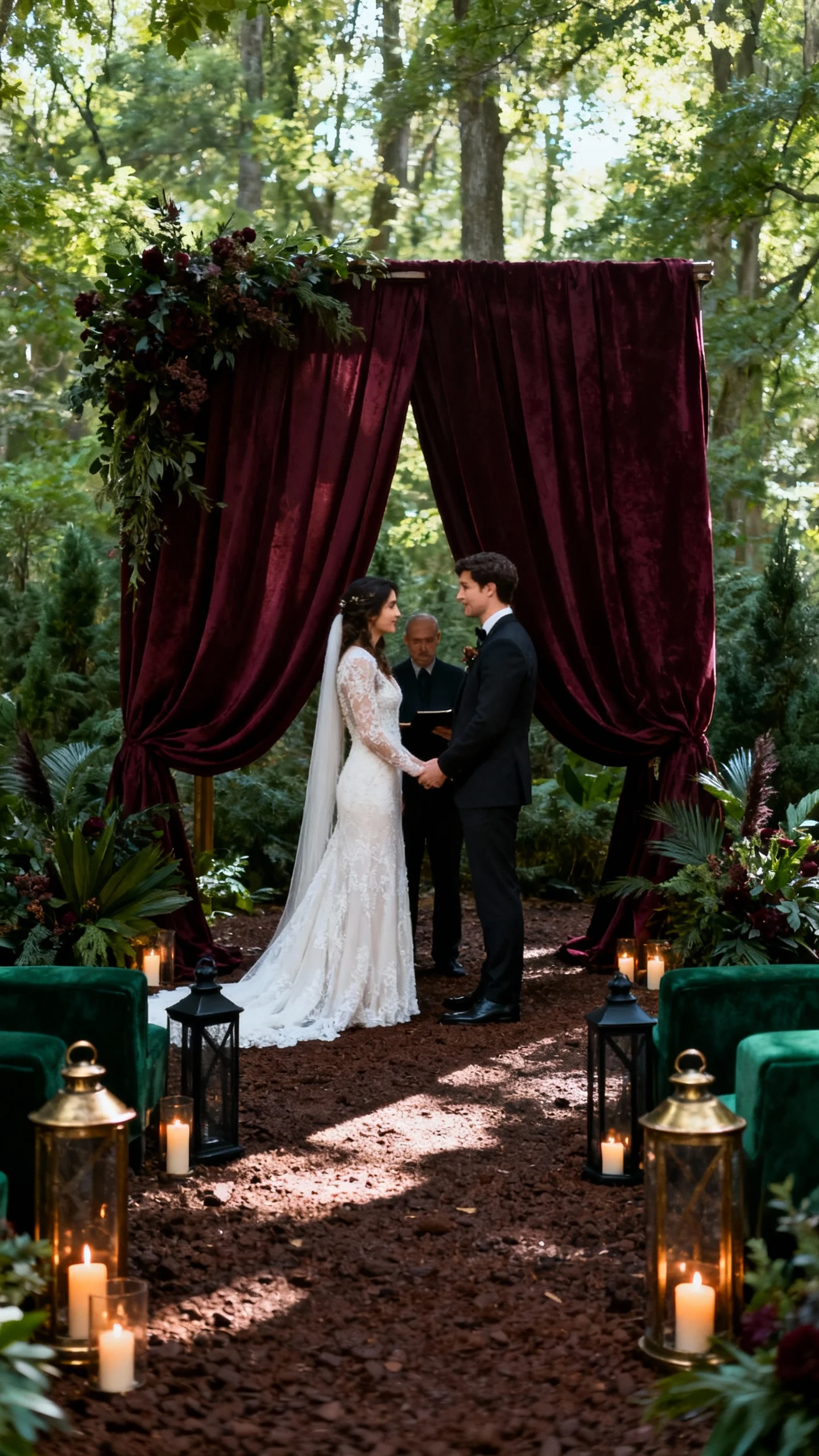 Moody decor is about contrast—dark tones, rich textures, and intentional shadows. Choose a palette like deep burgundy, forest green, espresso, navy, or charcoal, balanced with warm candlelight. Use heavy fabric draping on an arch or backdrop, and add ground arrangements for a cinematic look. Matte black or antique brass details help everything feel grounded and editorial.