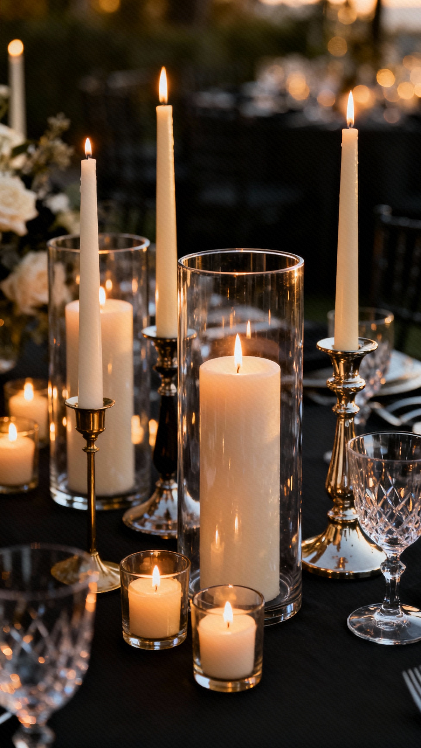 If your venue allows them, real candles create an unmatched glow and instantly elevate the room. To keep it safe and sleek, use glass hurricanes for pillar candles and plenty of votives for consistent sparkle. If open flame isn’t allowed, high-quality warm LED candles can still look beautiful in photos.