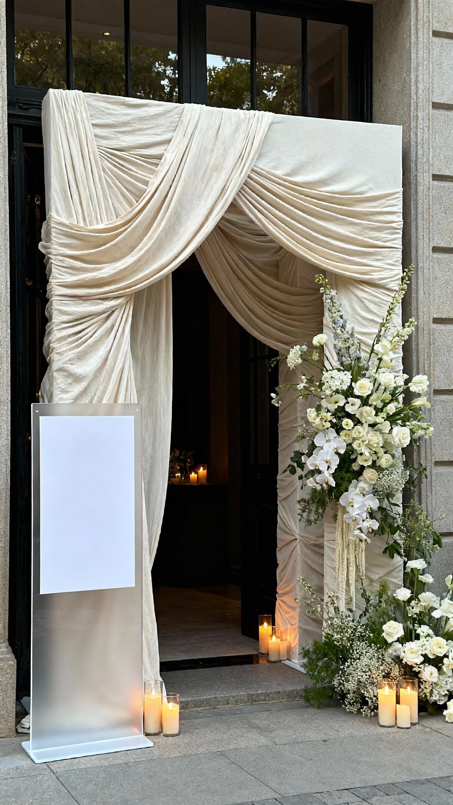 Balance clean lines with warmth: add candlelight, soft draping, and organic florals with movement. Mix materials so the room has depth—matte linens, glossy glassware, and a touch of metallic. A warm, welcoming entry moment (like a styled welcome sign with florals) also sets the tone immediately.
