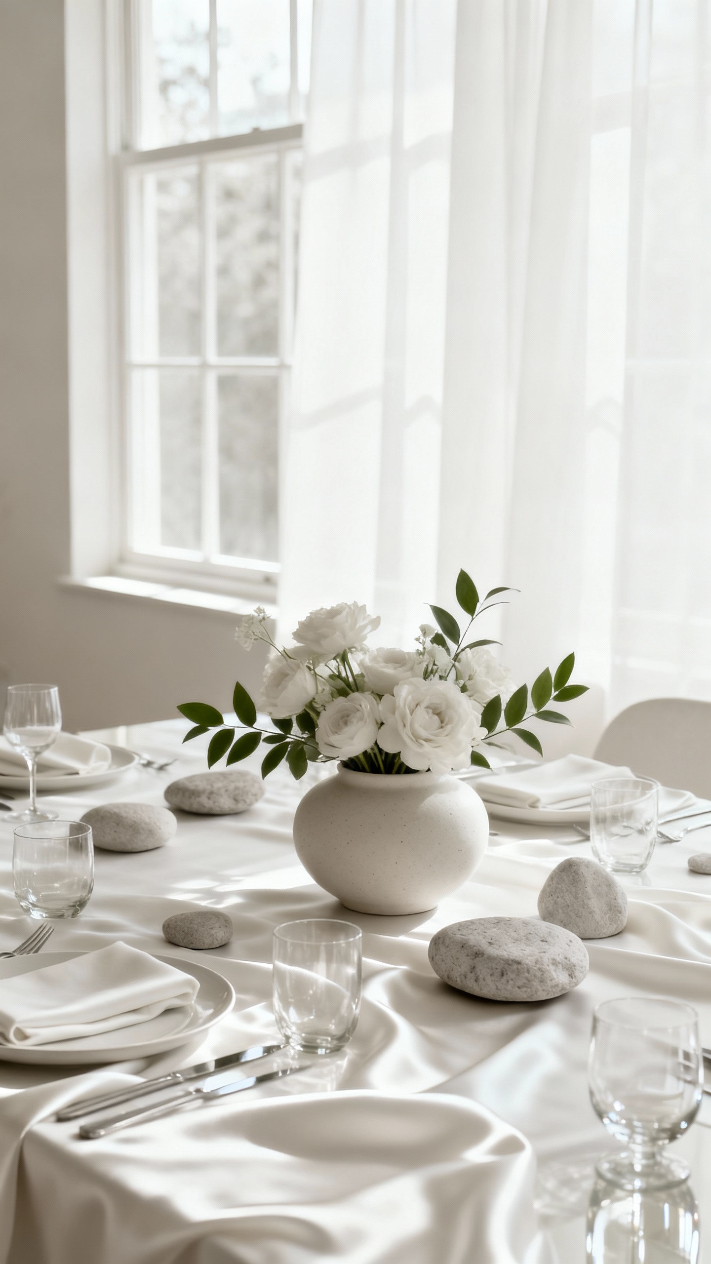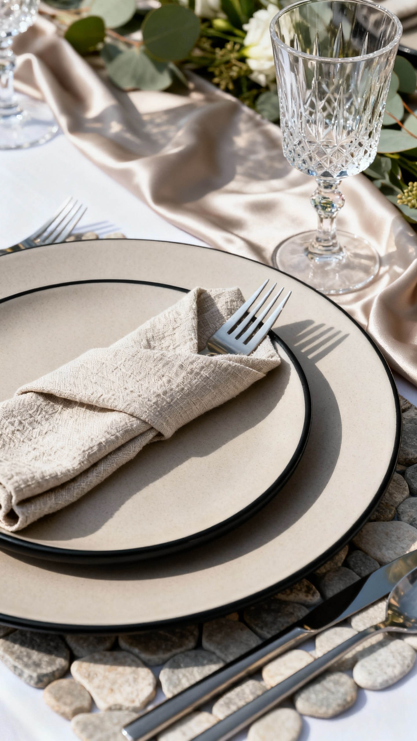 Instead of basic place settings, build a layered look: charger + textured napkin + modern flatware + a glass that feels special. Neutral plates with one bold detail (like a black rim or subtle pattern) photograph so well and don’t compete with florals. Add a small personalized touch at each seat—like a name card on a silk ribbon—for that curated, editorial feel. This is one of those details guests actually notice up close.