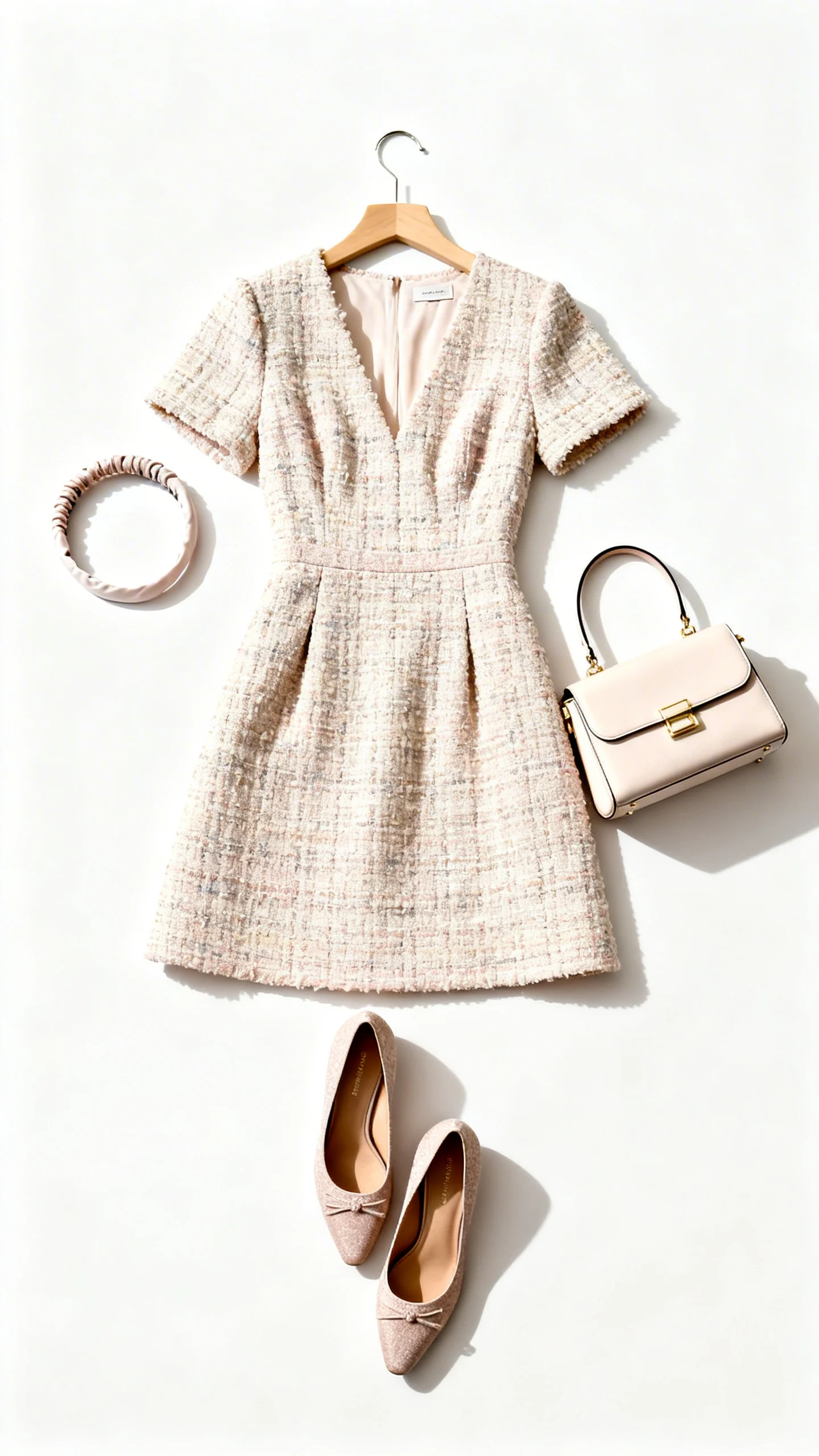 If the shower leans dressy and fashion-forward, a structured mini in tweed or bouclé can be a fun pick. Keep the rest of the look sophisticated: closed-toe flats, a simple headband, and a classic handbag. Pay attention to length and fit so it feels classy and event-appropriate. A soft neutral or pastel keeps it bridal-shower sweet, not harsh.