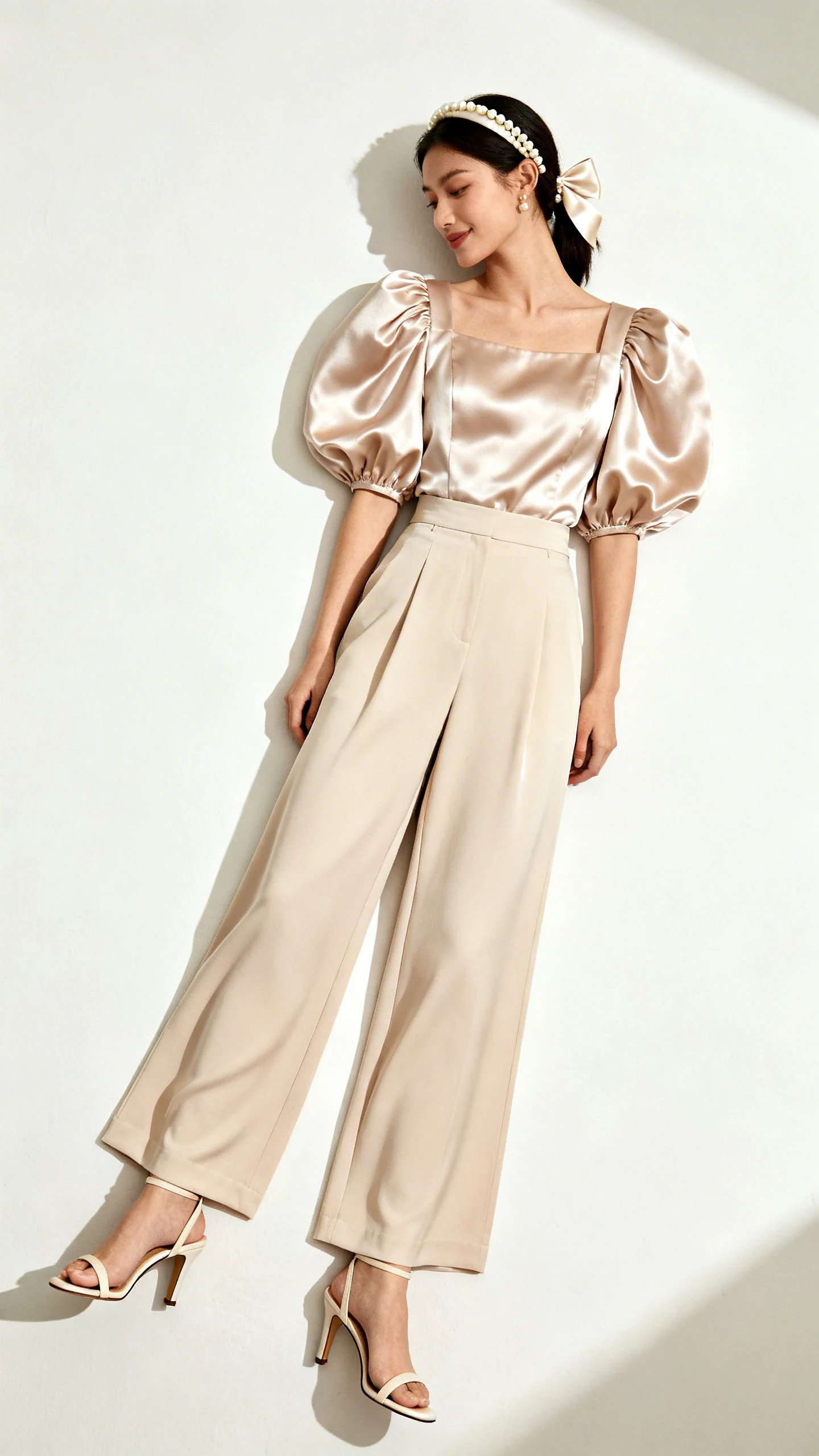 When you don’t want a dress, wide-leg trousers with a dressy top hit the sweet spot between relaxed and refined. Choose pants in a drapey fabric and a top with special detail—think puff sleeves, satin, or a pretty neckline. Keep the proportions balanced by tucking in the top or opting for a cropped length. Finish with heeled sandals and a hair accessory that feels celebration-ready.