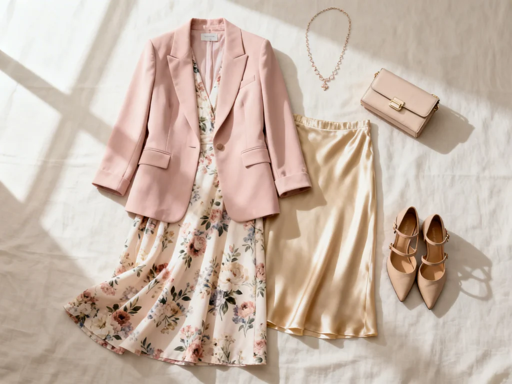 A pastel suit is chic, structured, and surprisingly easy to wear, especially for restaurant or city showers. Choose a relaxed blazer with straight-leg trousers to keep it current. Underneath, a silky cami or fitted knit makes the look feel soft and celebration-ready. Add pointed-toe flats or low heels and a delicate necklace.